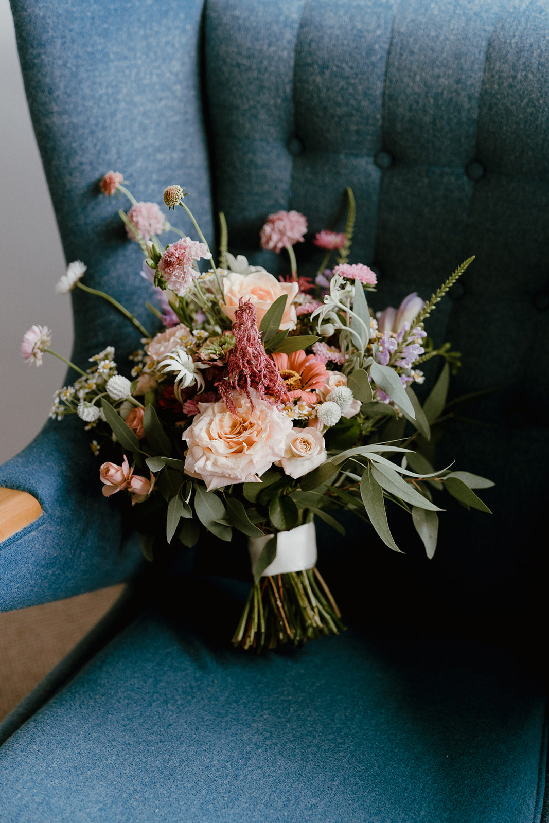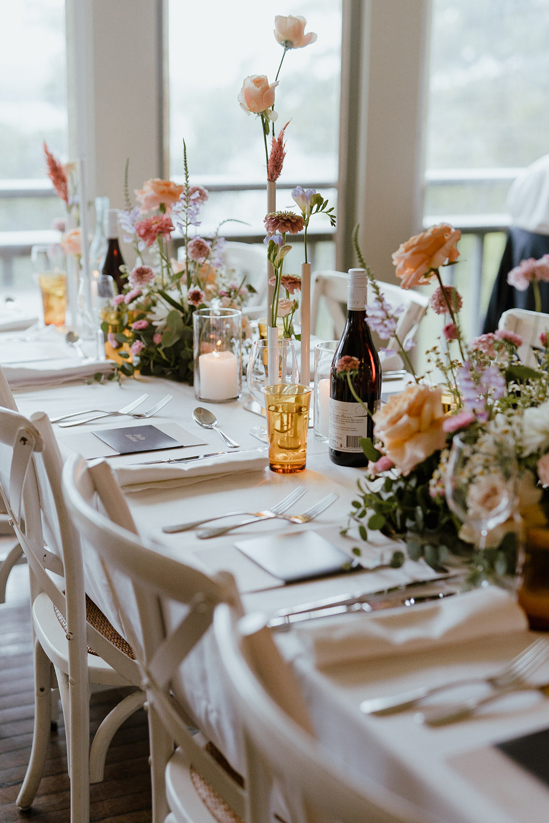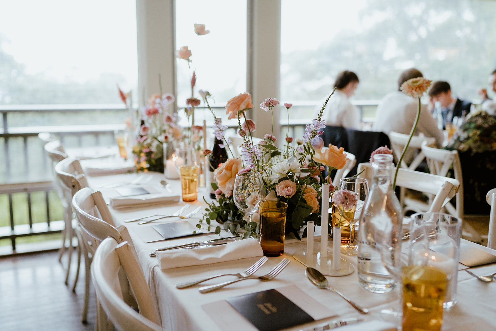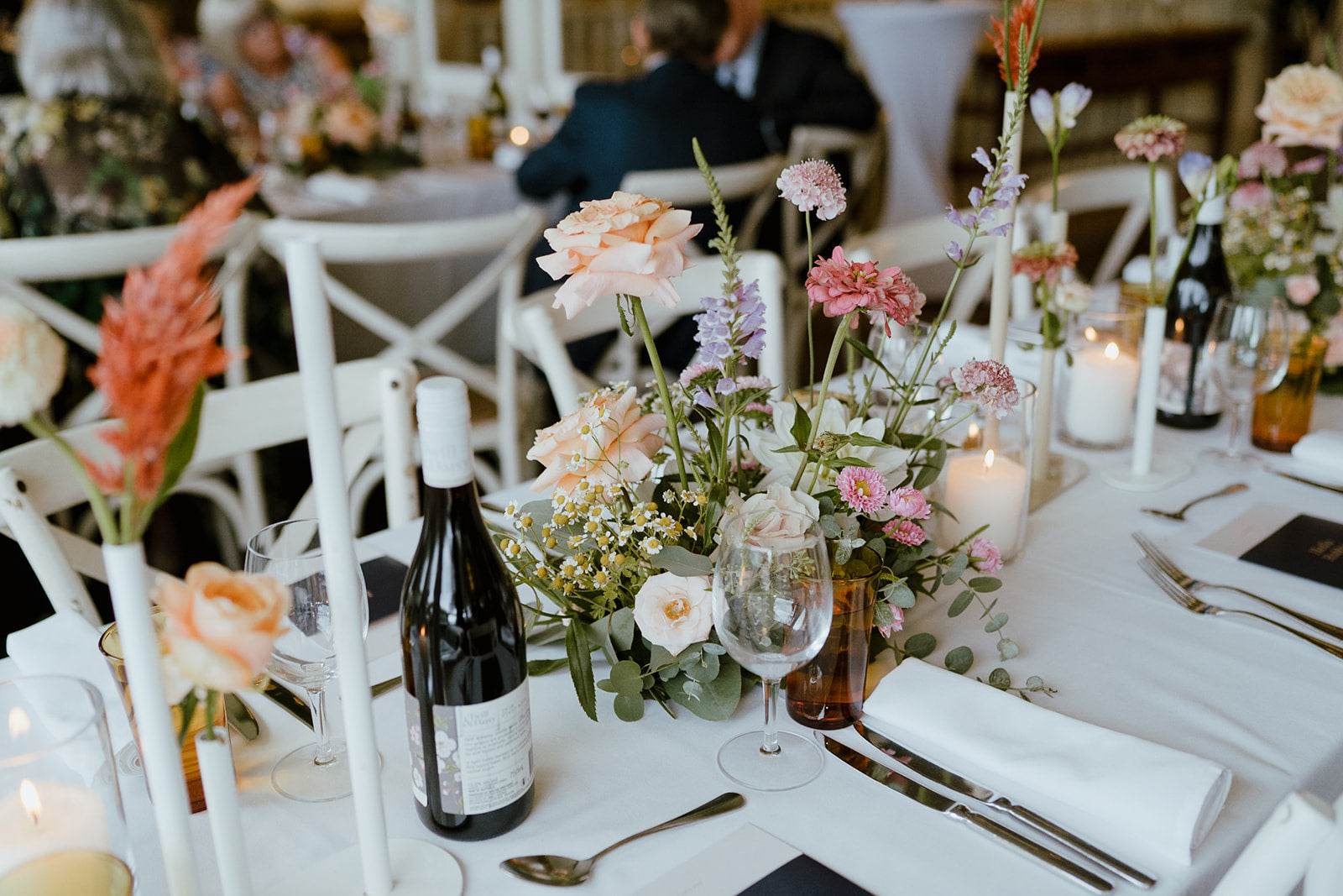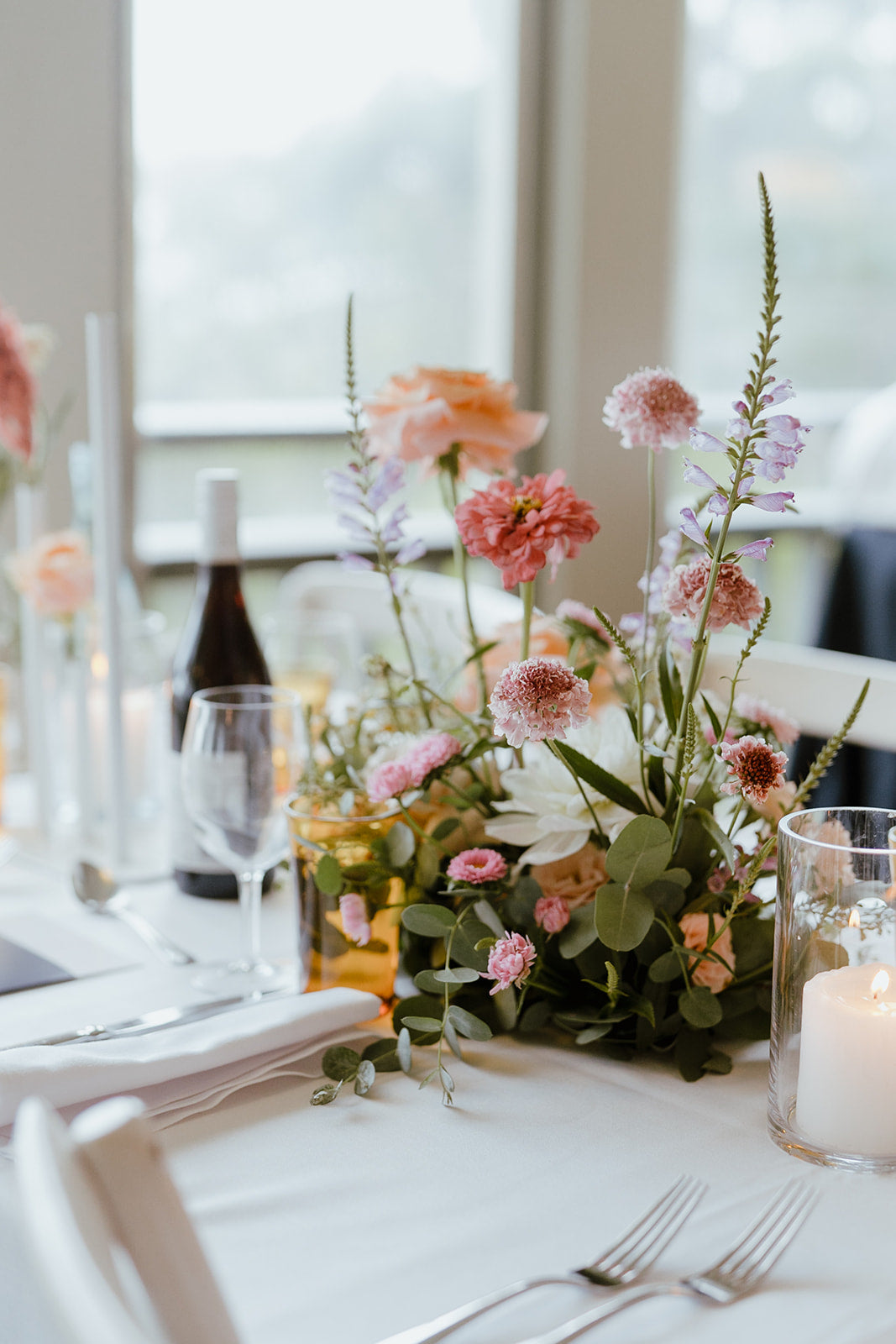 Reception tables carry on the theme but added in more delicate floral that is more suitable for table centerpiece ie Scabiosa, local garden roses for a fresh, garden-inspired feel.