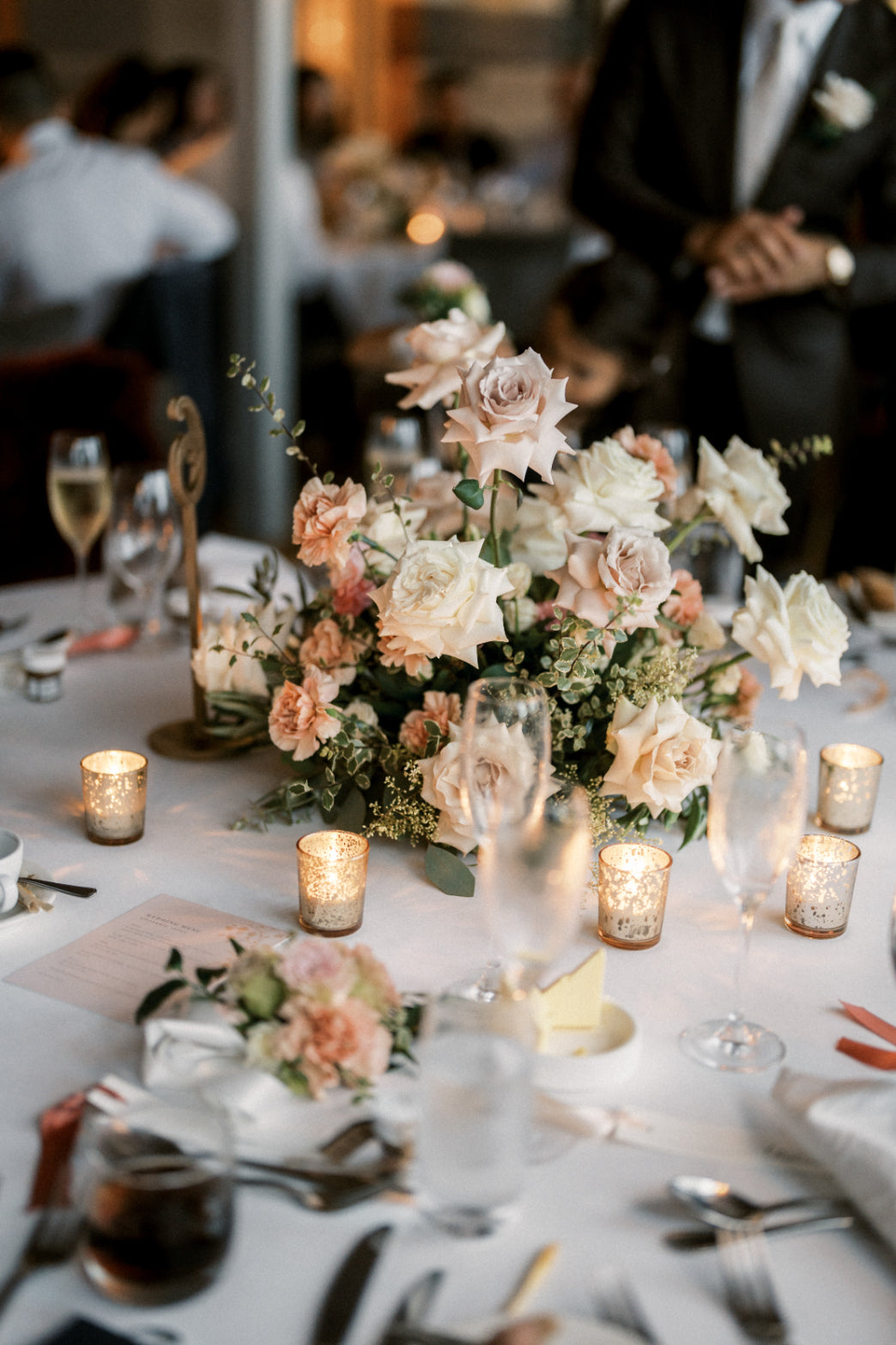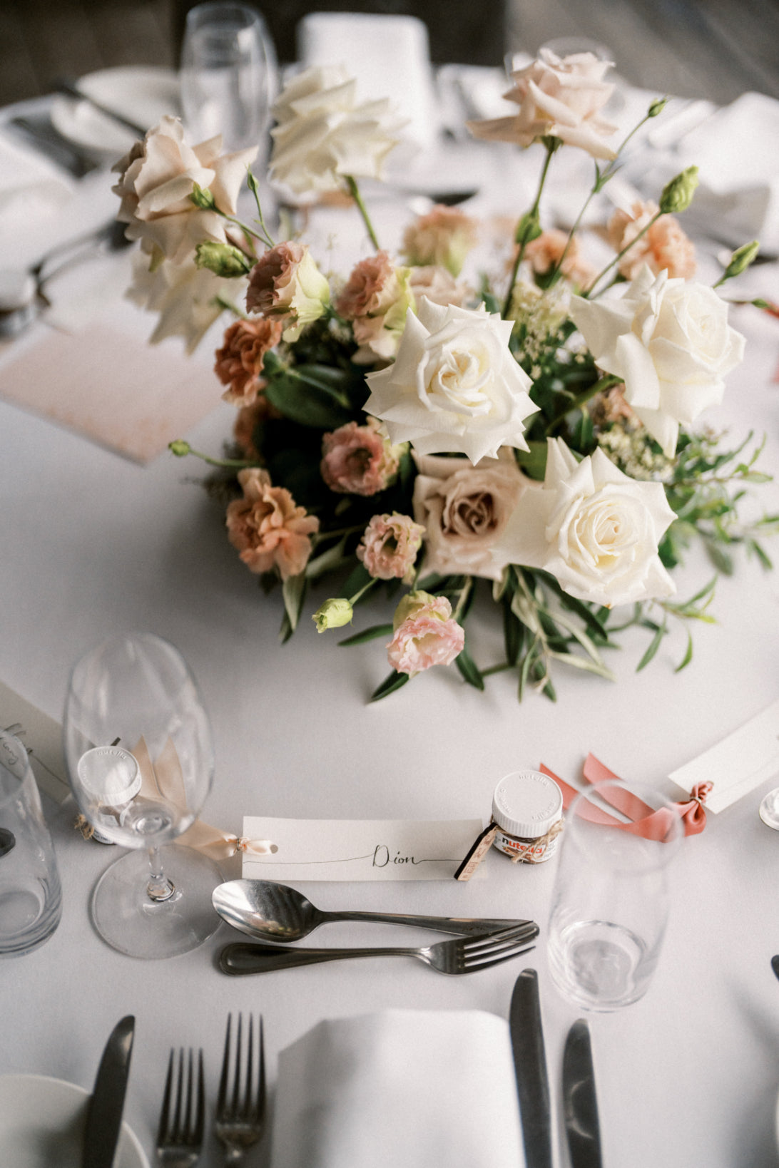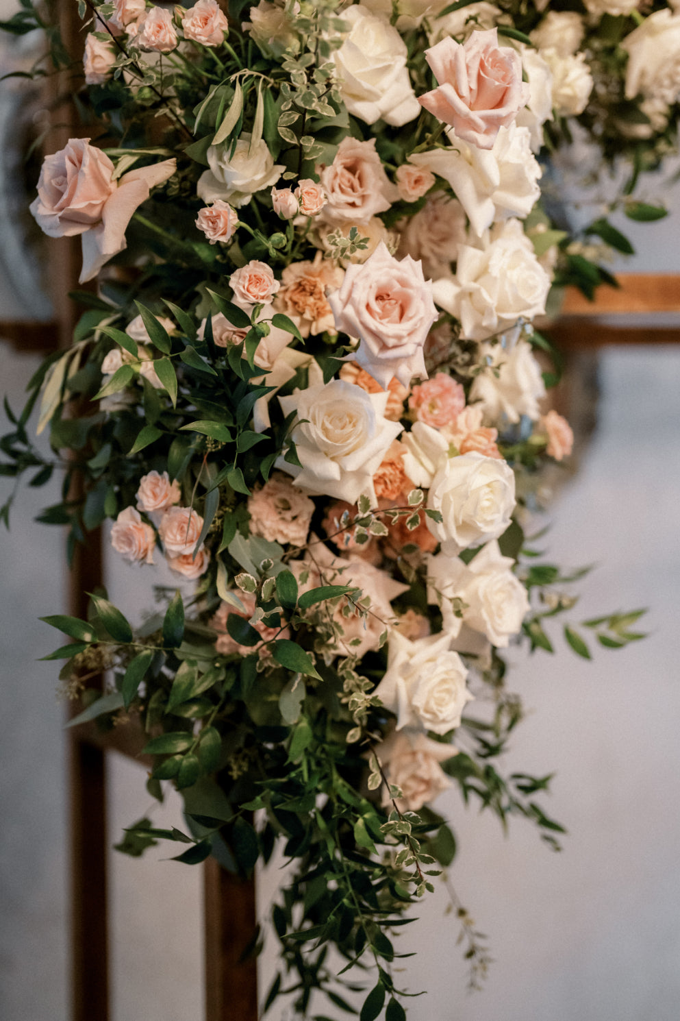 Everything from the bouquets to ceremony to table arrangements use premium Columbian roses ie Quicksand, Playa Blanca, mixing with cappuccino tone carnation, olive foliage and Italian Ruscus to complete the look.