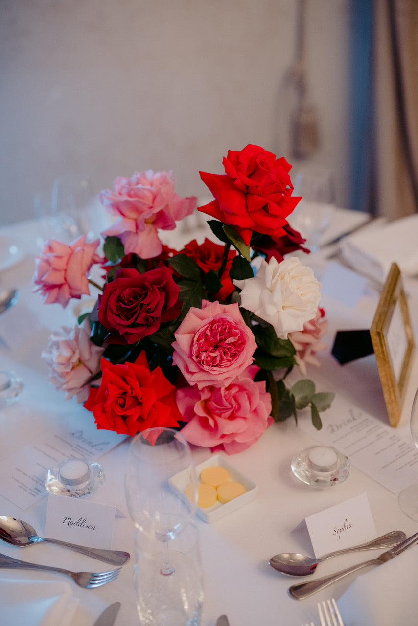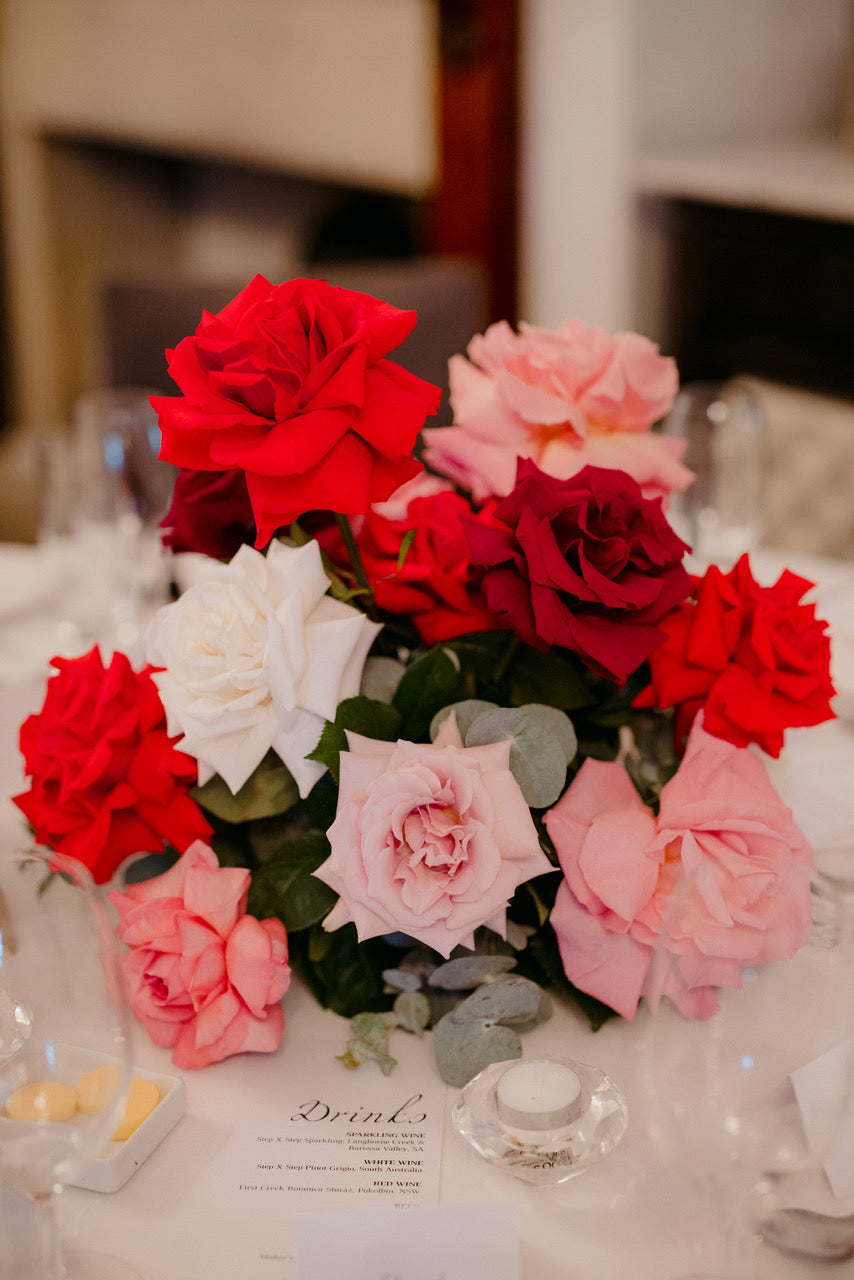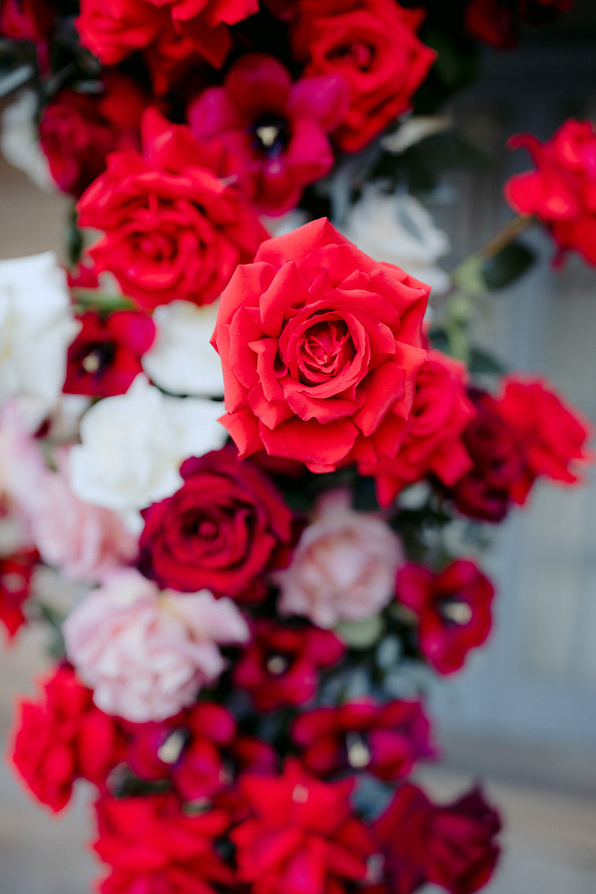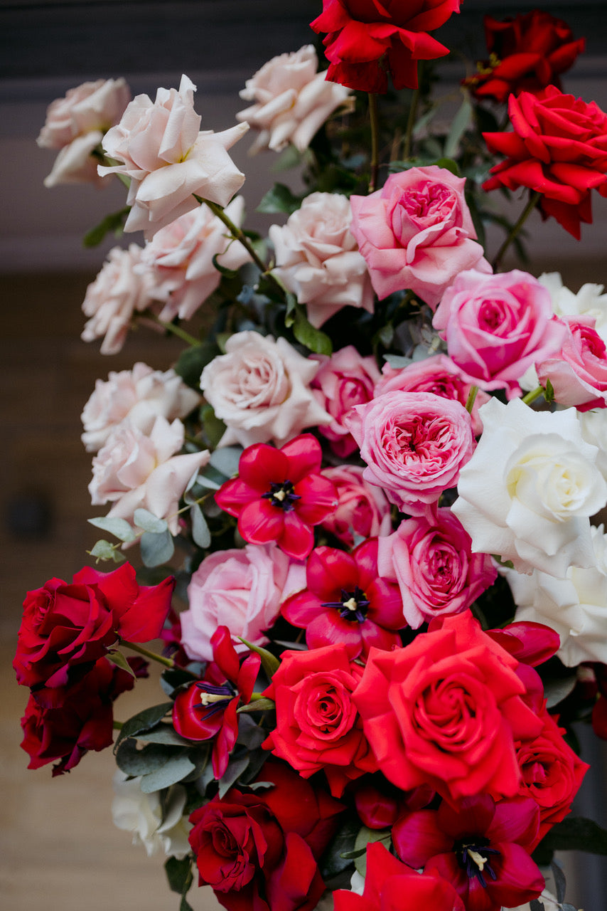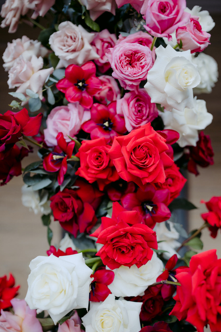 Different shades of Reds and Pinks with accent on the vibrant reds, we chose Nina Rose as the feature flowers. Mixing with red Tulips, Hermosa roses, and to incorporate pops of pastel colours like Quicksand Playa blanca roses, this wedding is hot, hot, hot!