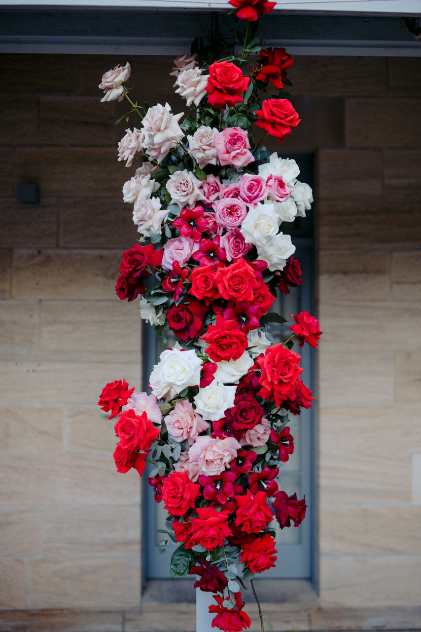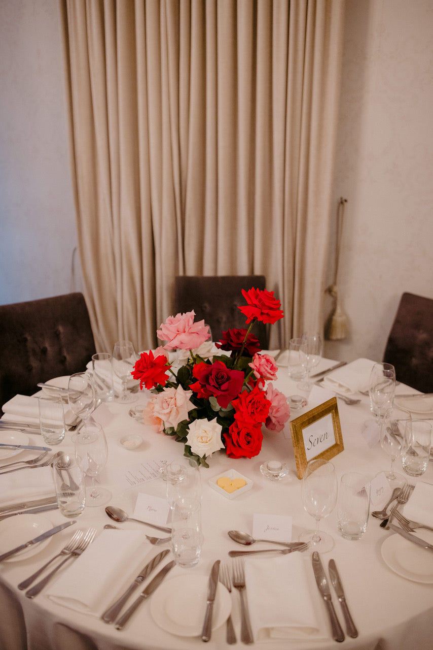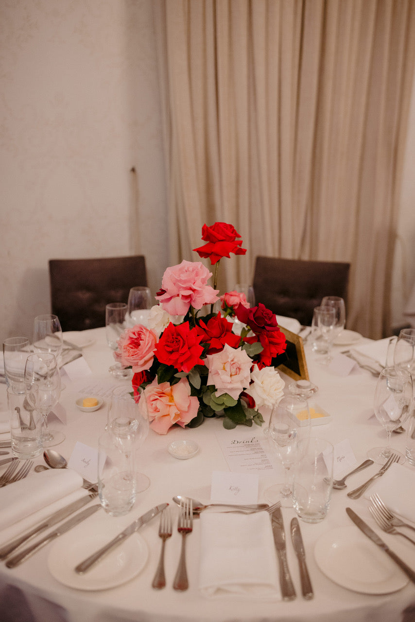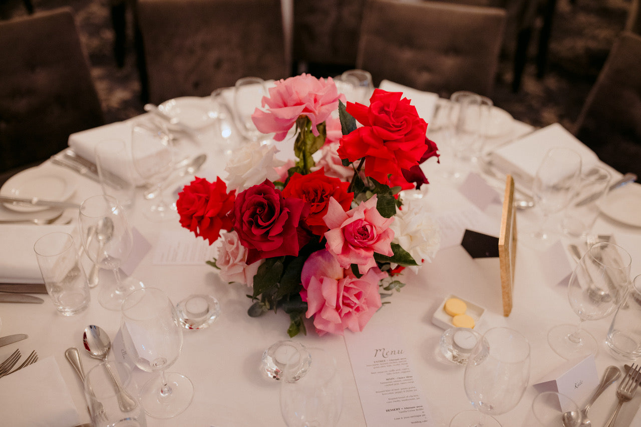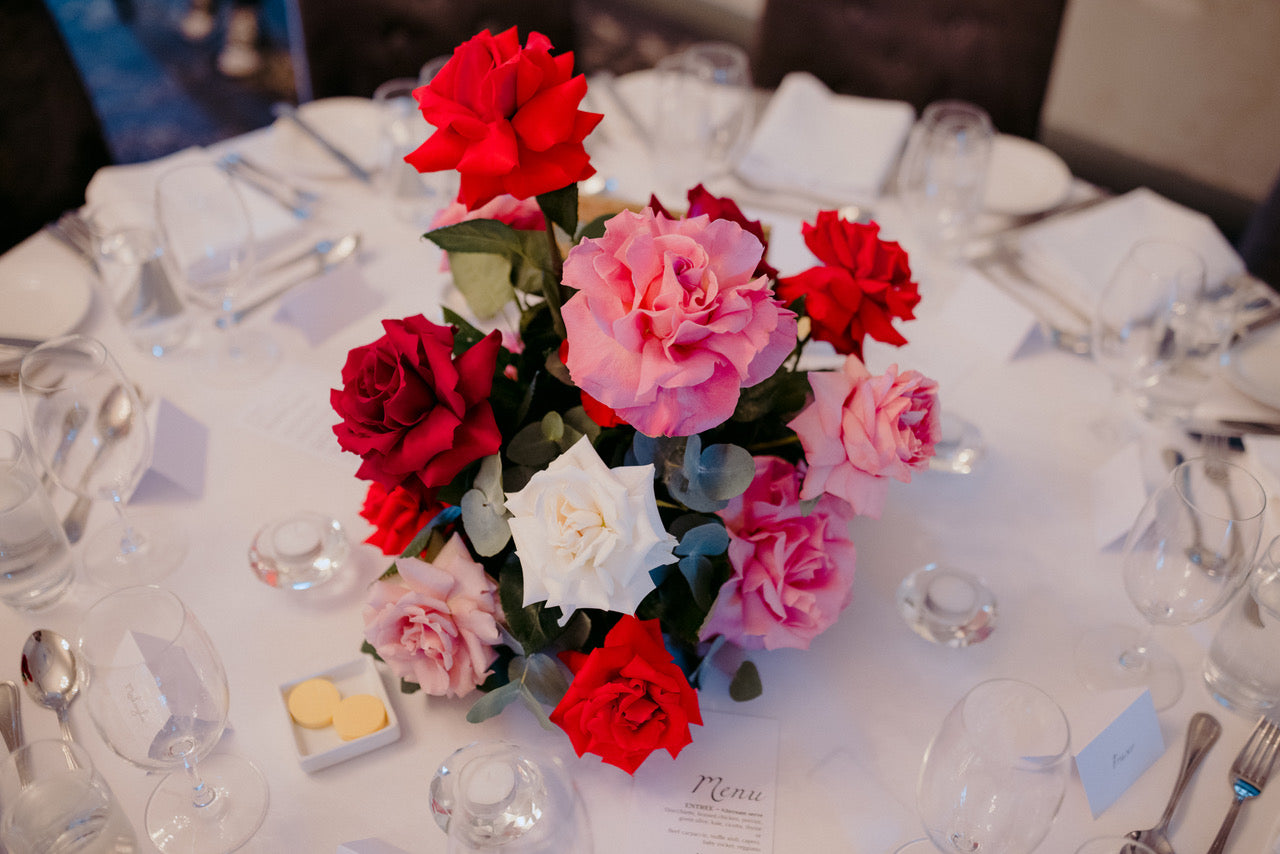 Different shades of Reds and Pinks with accent on the vibrant reds, we chose Nina Rose as the feature flowers. Mixing with red Tulips, Hermosa roses, and to incorporate pops of pastel colours like Quicksand Playa blanca roses, this wedding is hot, hot, hot!