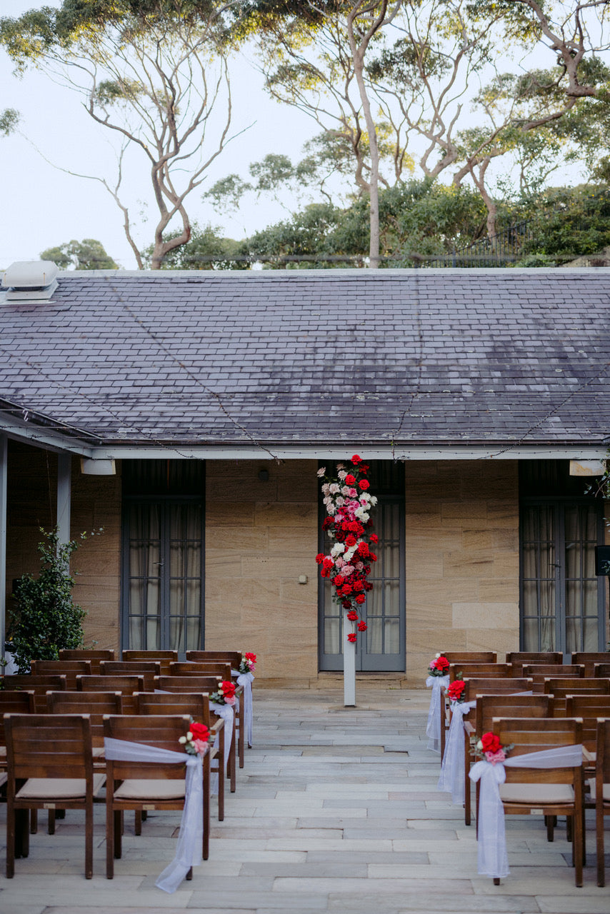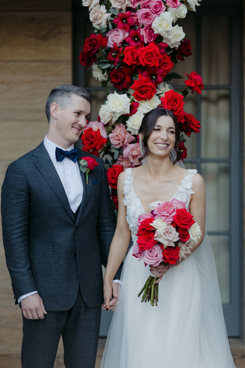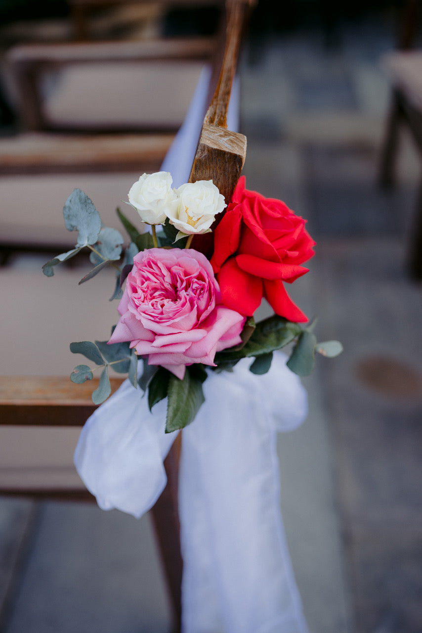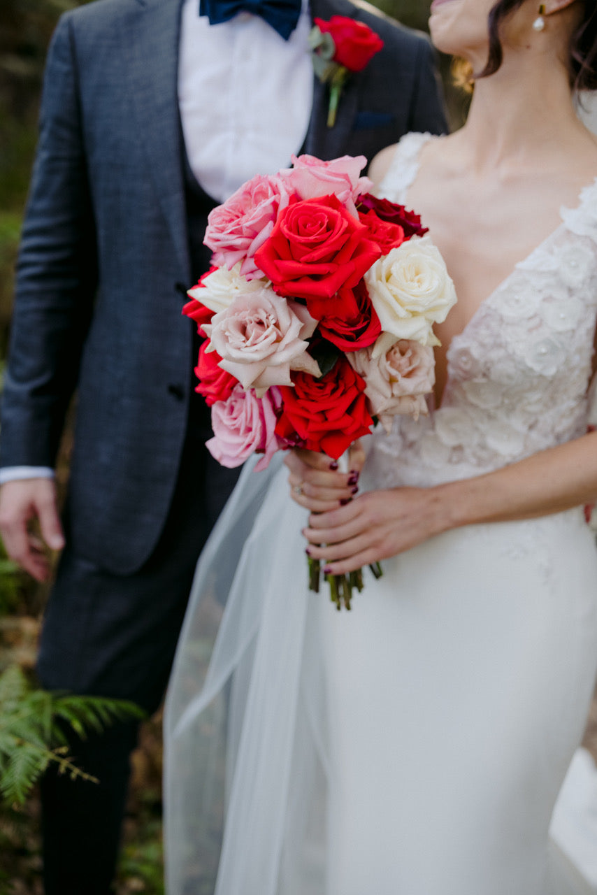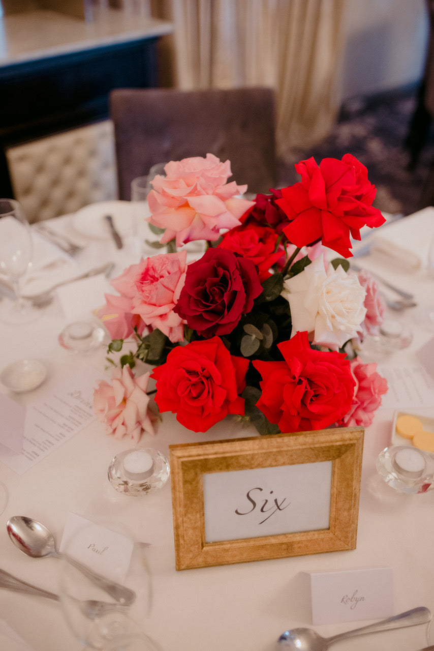 Different shades of Reds and Pinks with accent on the vibrant reds, we chose Nina Rose as the feature flowers. Mixing with red Tulips, Hermosa roses, and to incorporate pops of pastel colours like Quicksand Playa blanca roses, this wedding is hot, hot, hot!