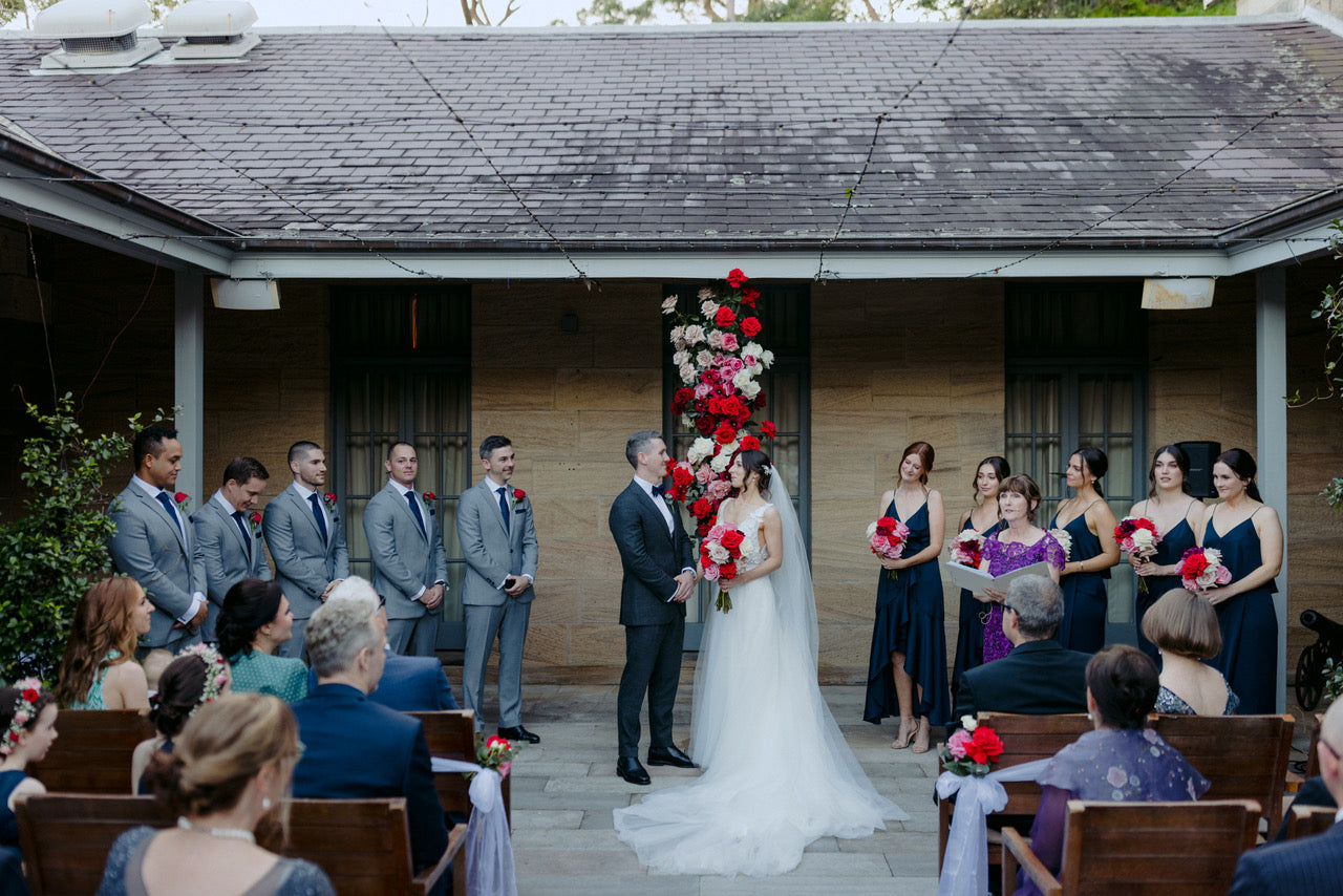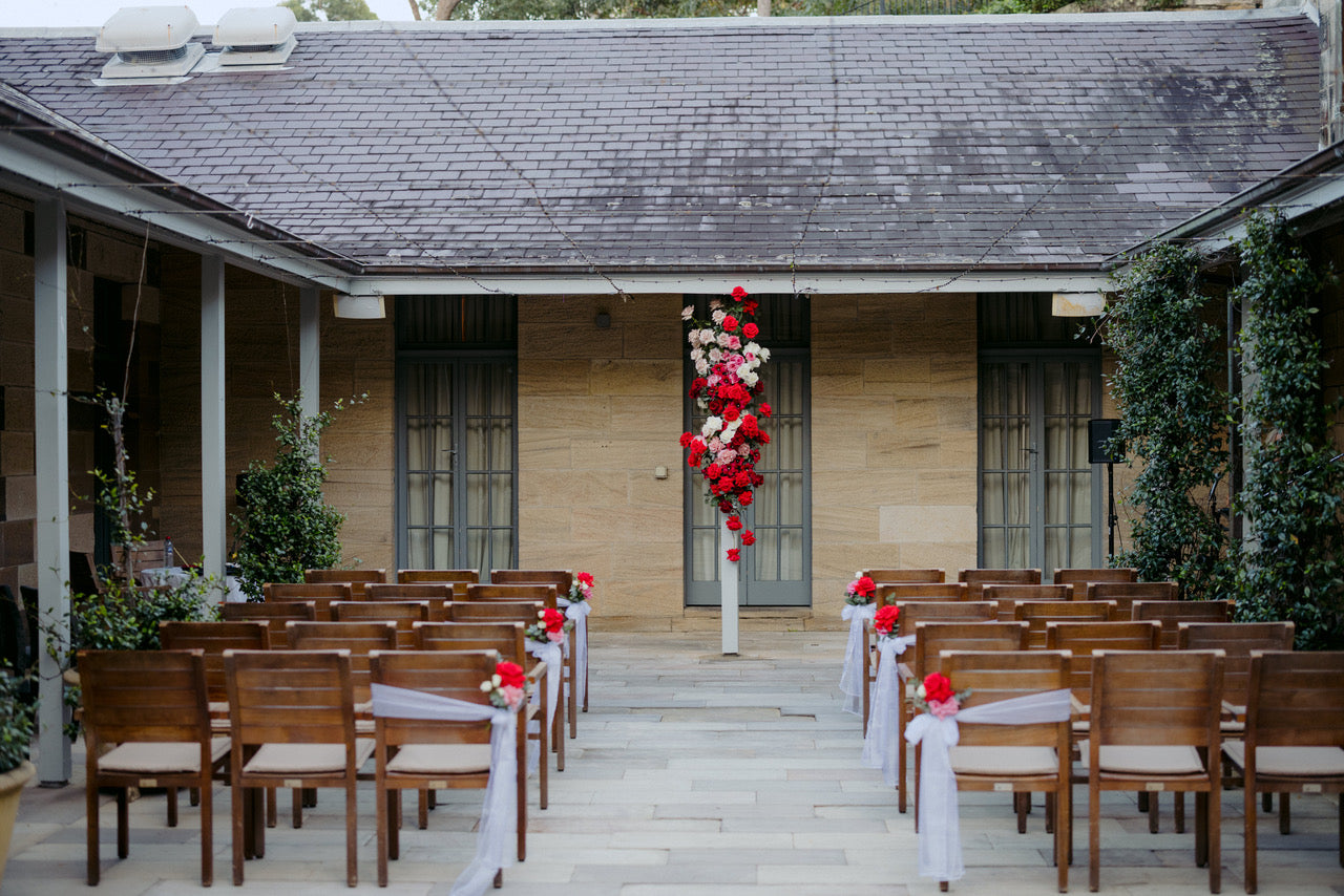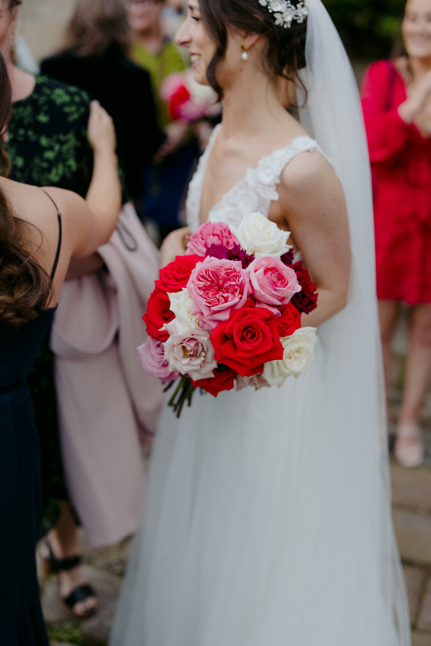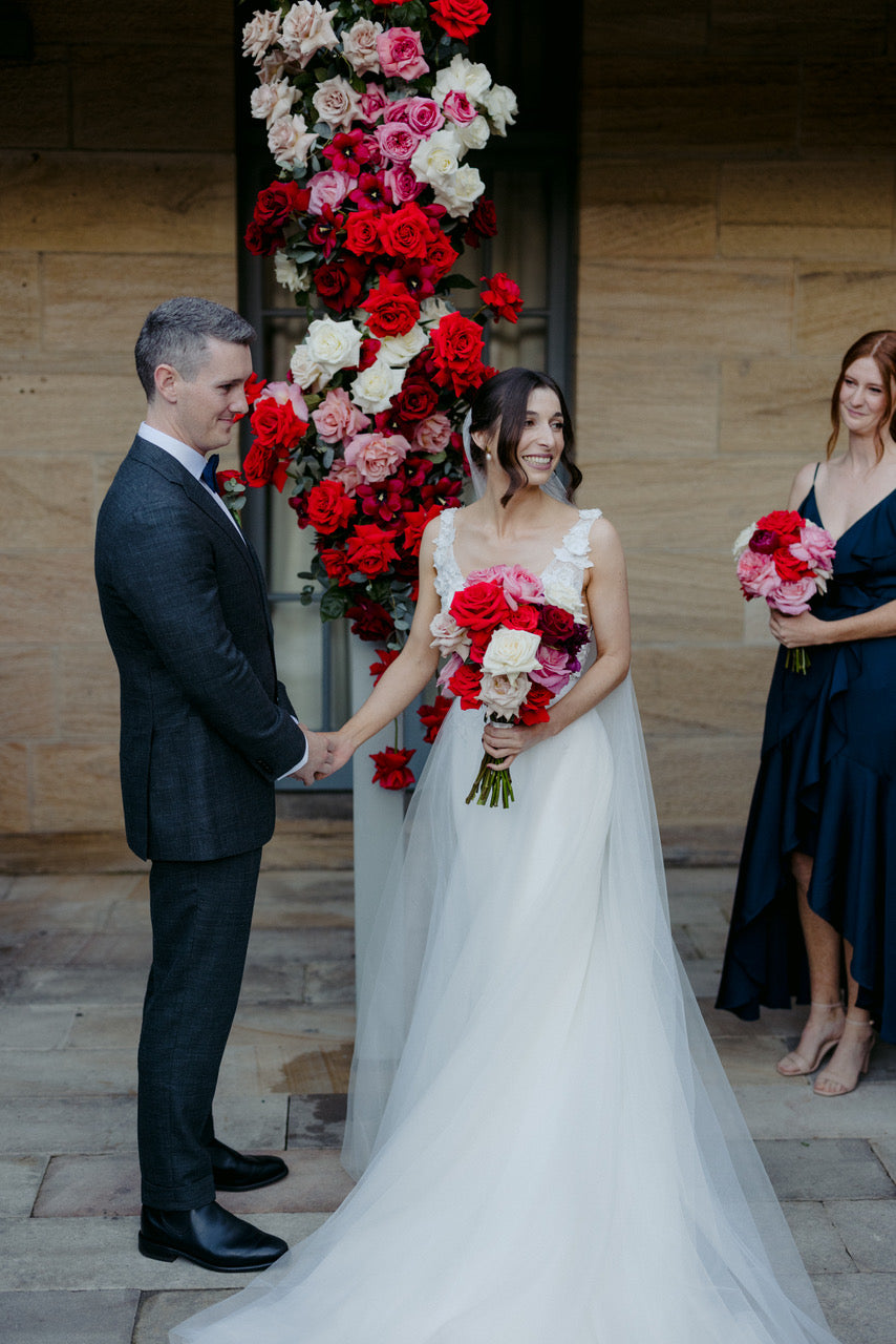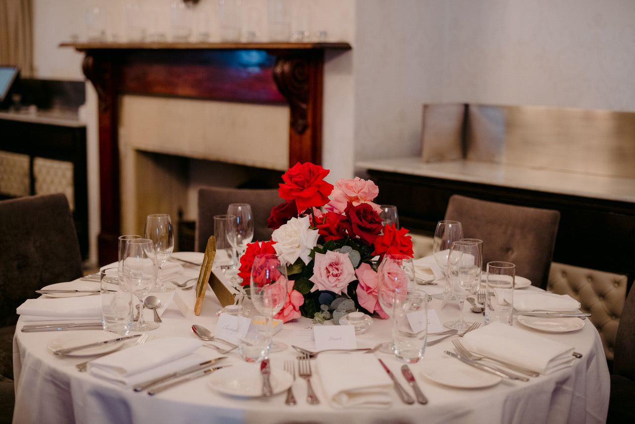 Different shades of Reds and Pinks with accent on the vibrant reds, we chose Nina Rose as the feature flowers. Mixing with red Tulips, Hermosa roses, and to incorporate pops of pastel colours like Quicksand Playa blanca roses, this wedding is hot, hot, hot!