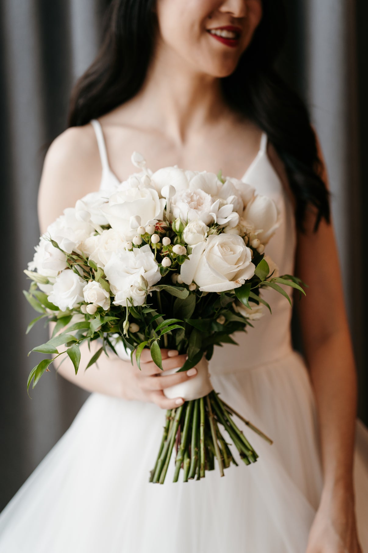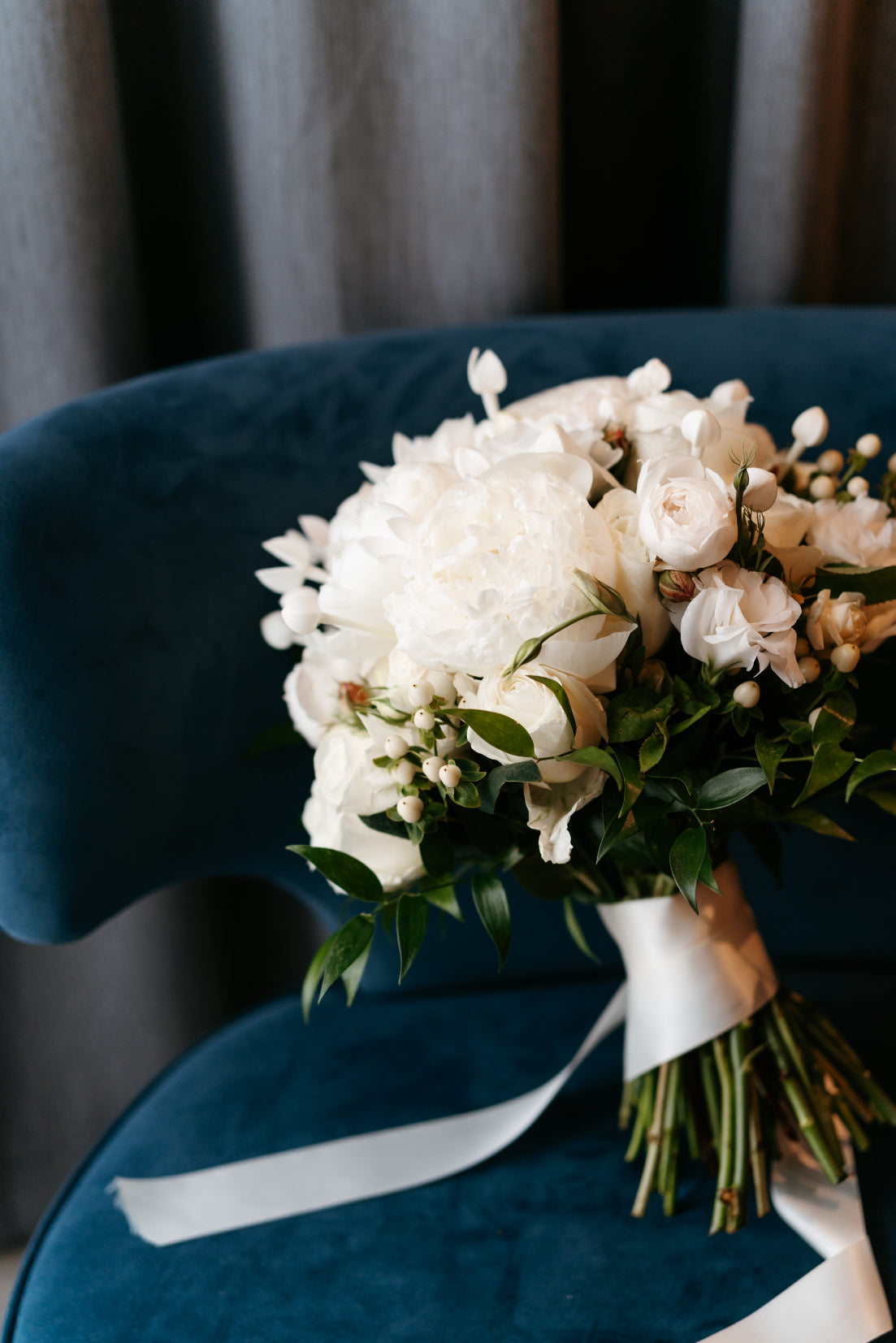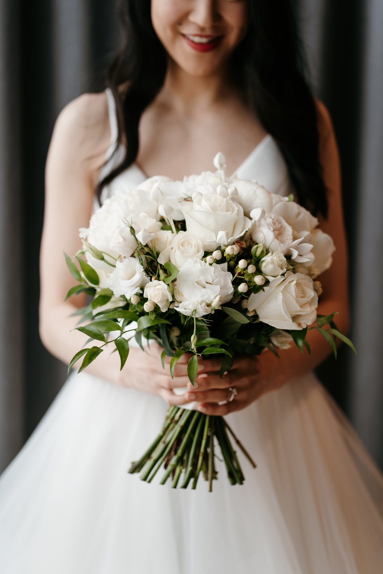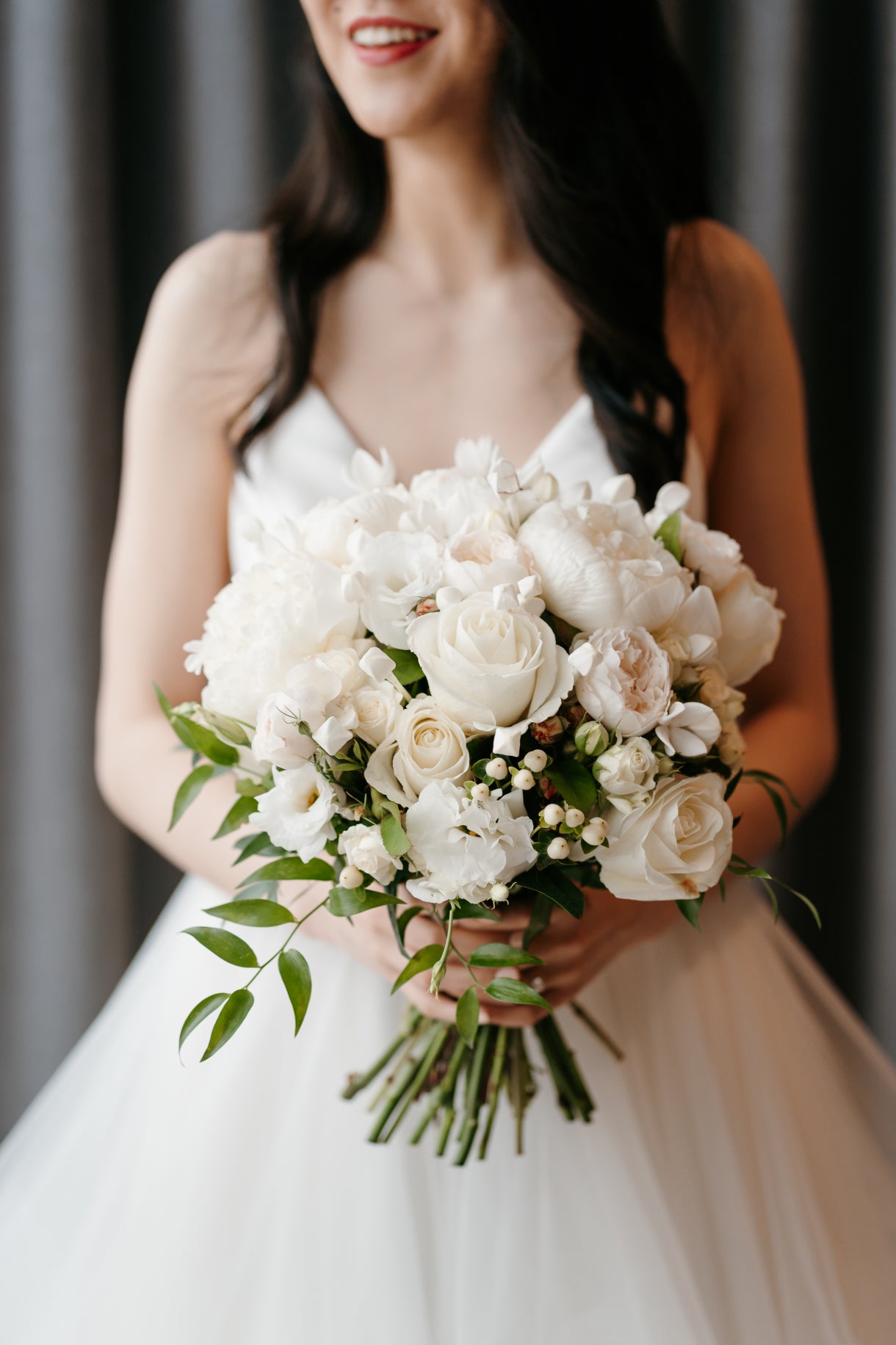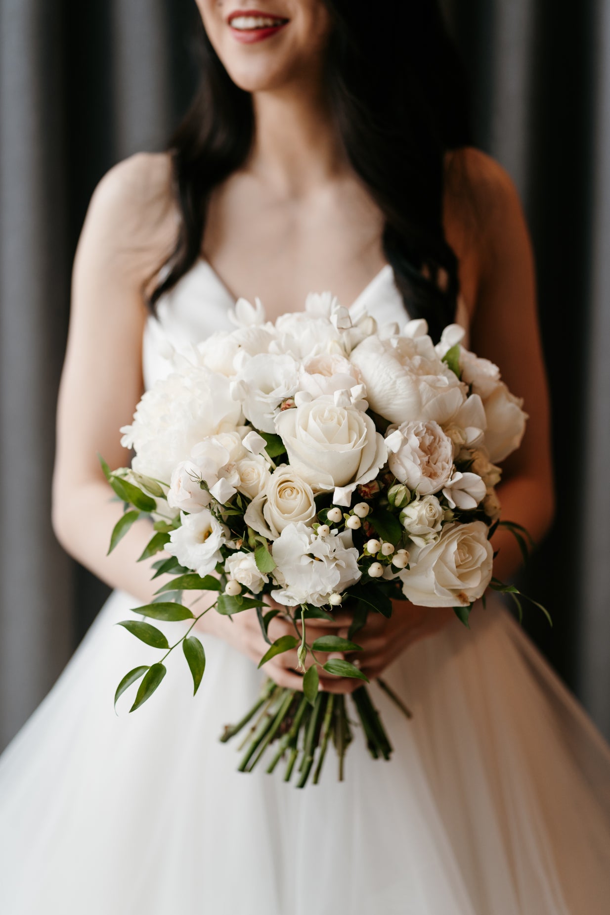 Stephanie’s bridal bouquet features white peonies and white roses, balanced with the textured of hypericum and lisianthus.