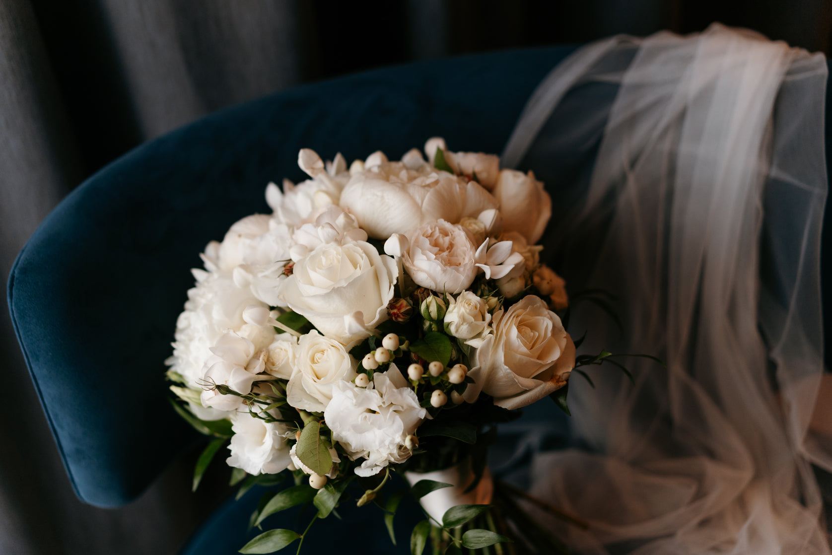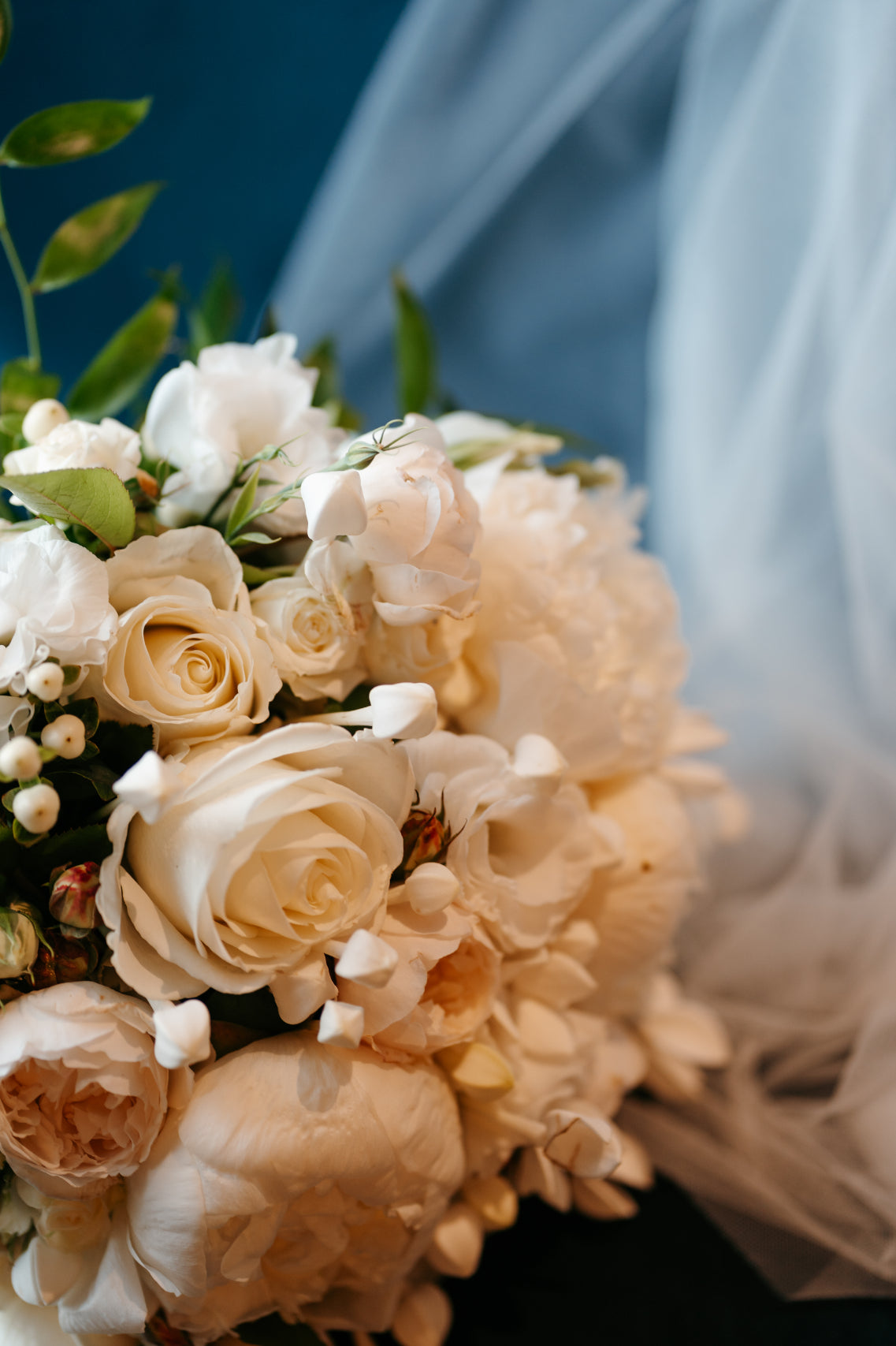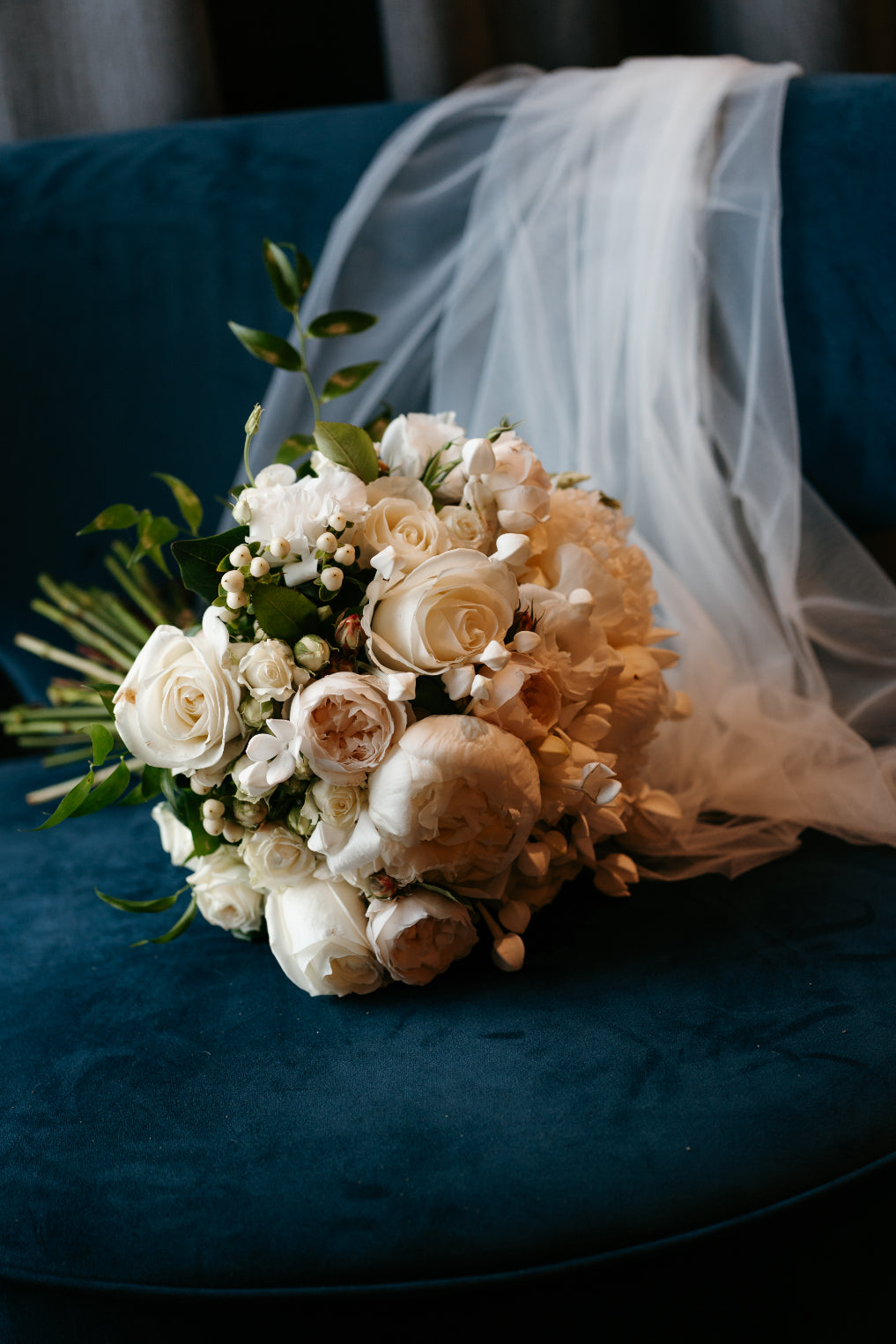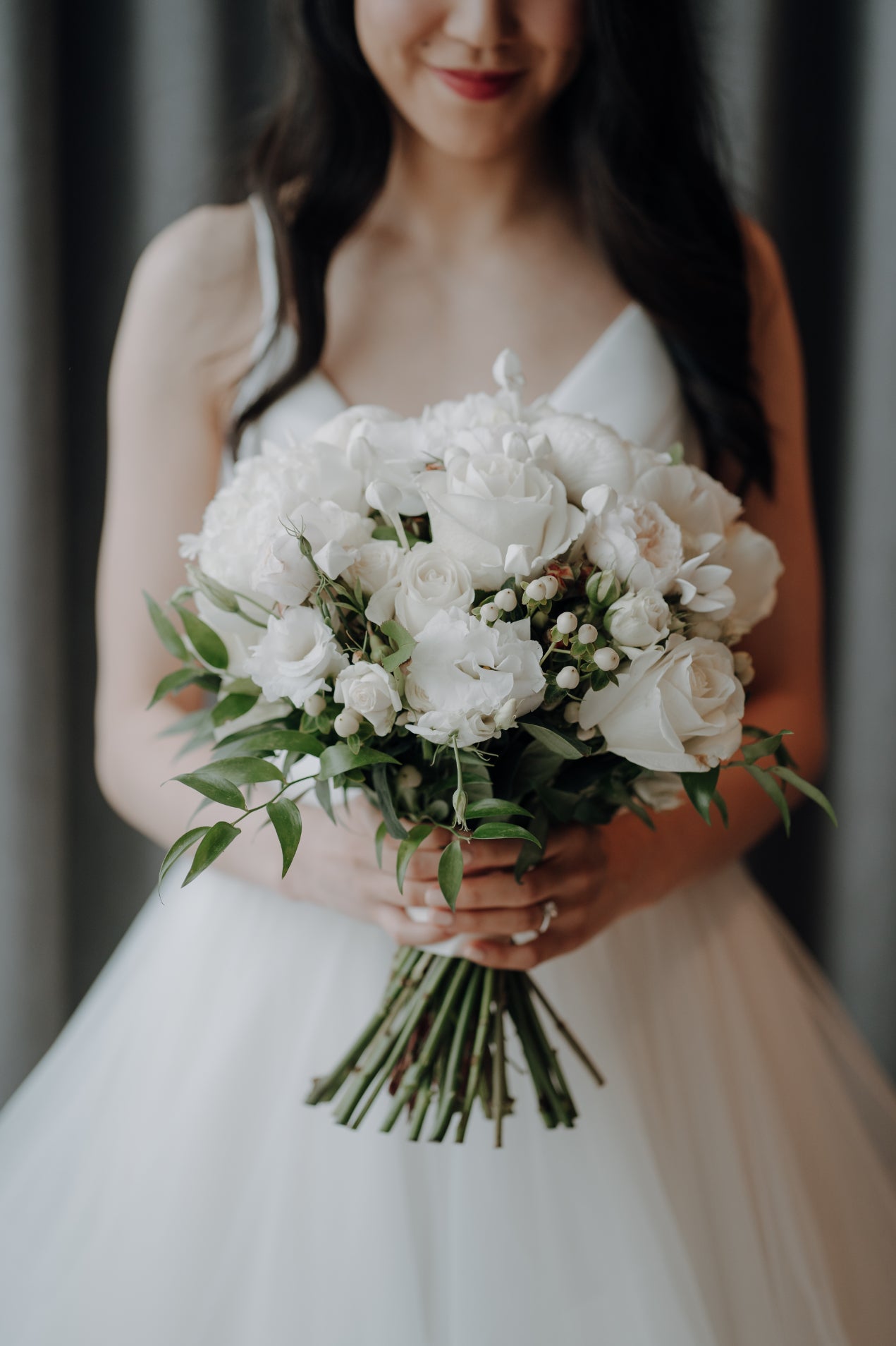 Stephanie’s bridal bouquet features white peonies and white roses, balanced with the textured of hypericum and lisianthus.