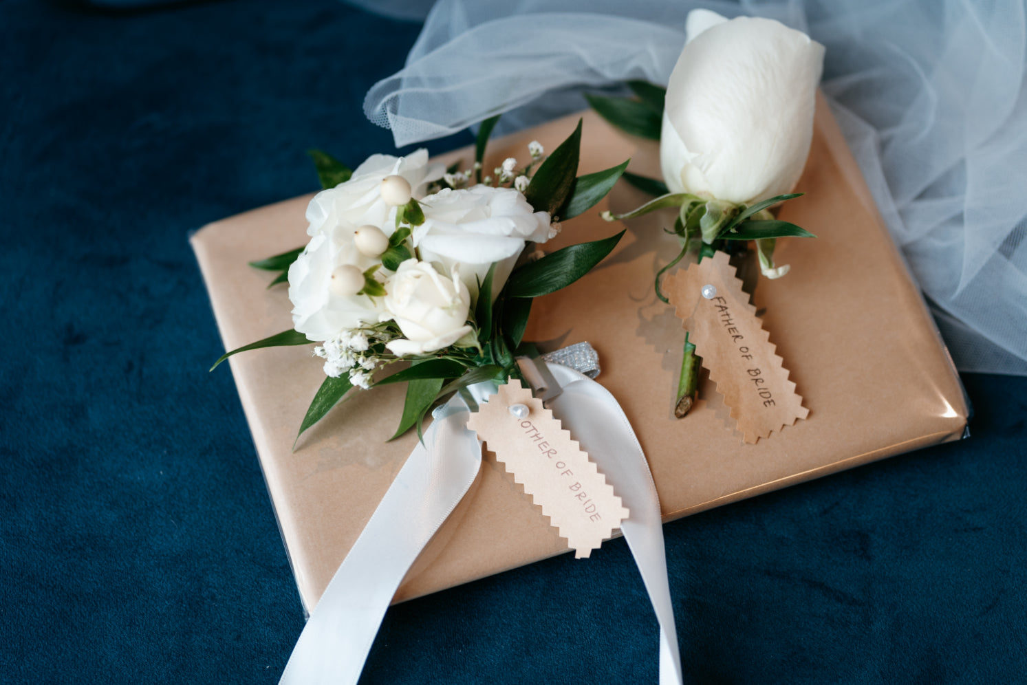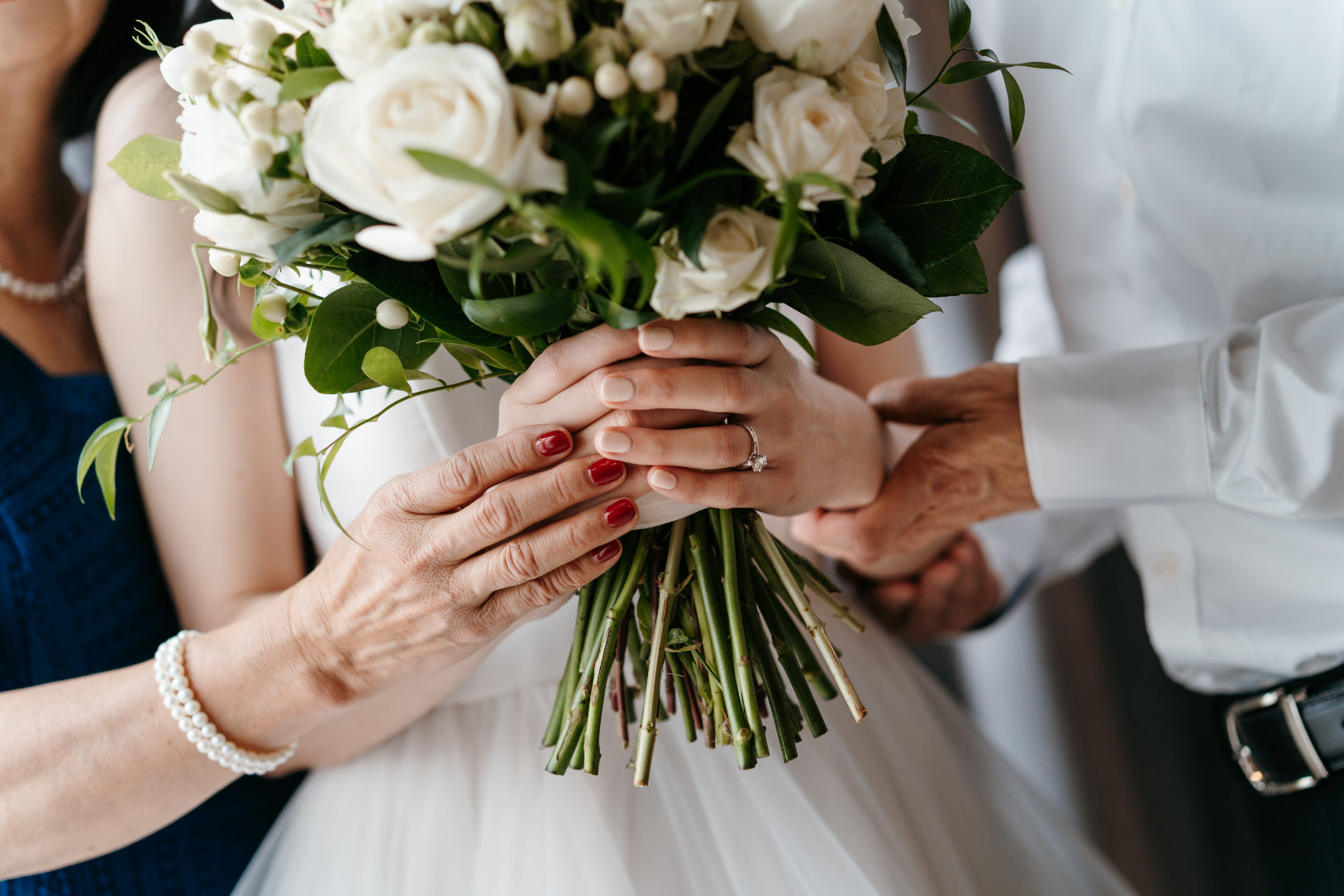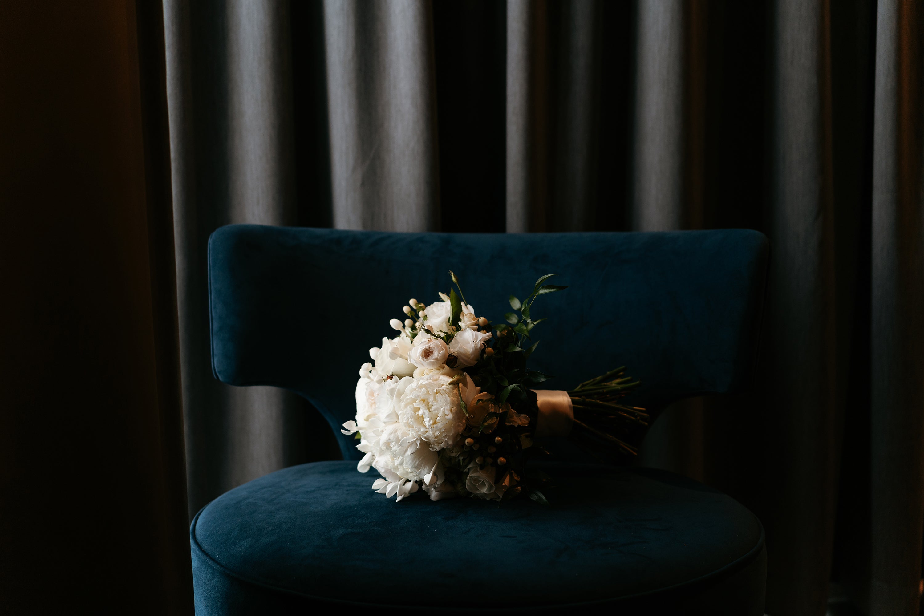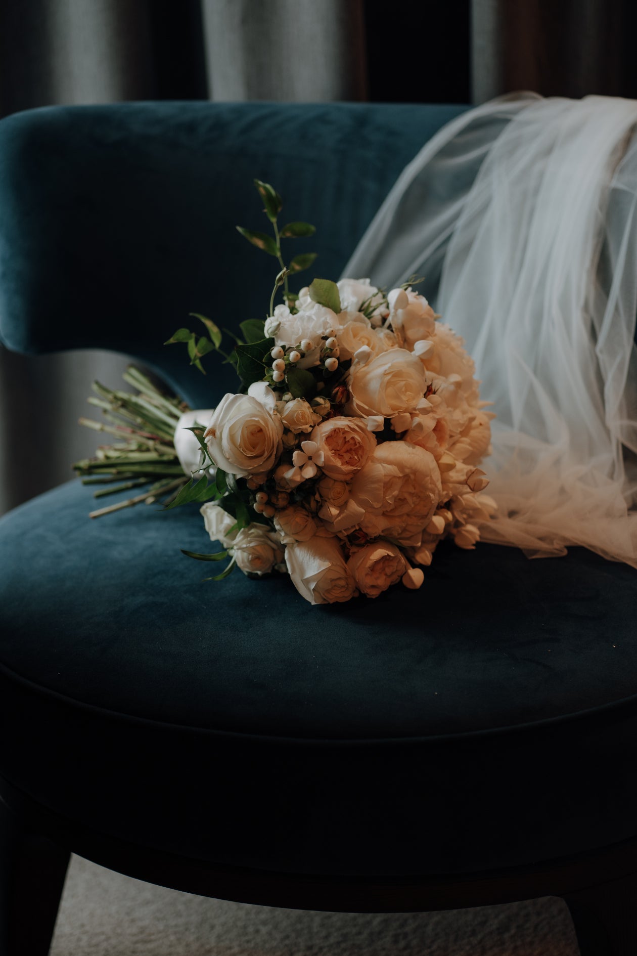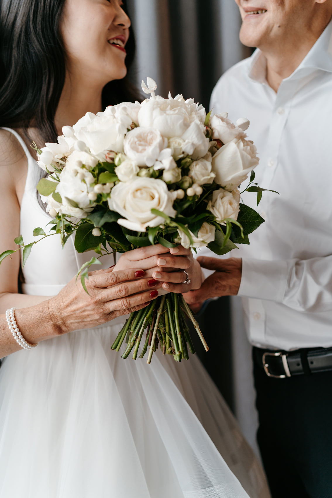 Stephanie’s bridal bouquet features white peonies and white roses, balanced with the textured of hypericum and lisianthus.