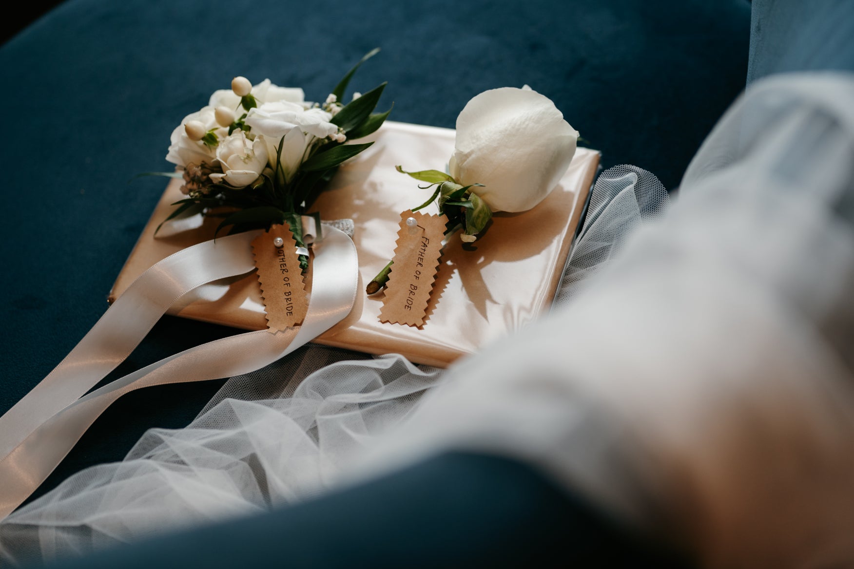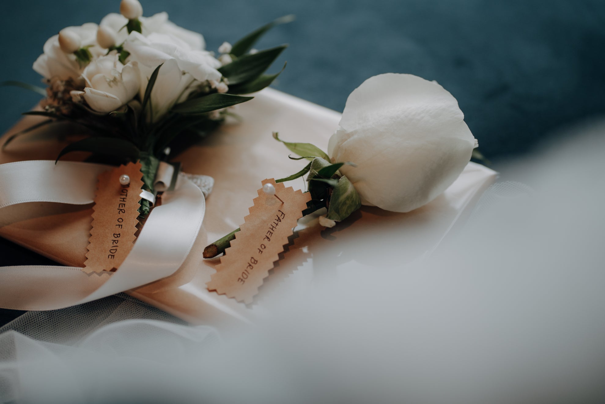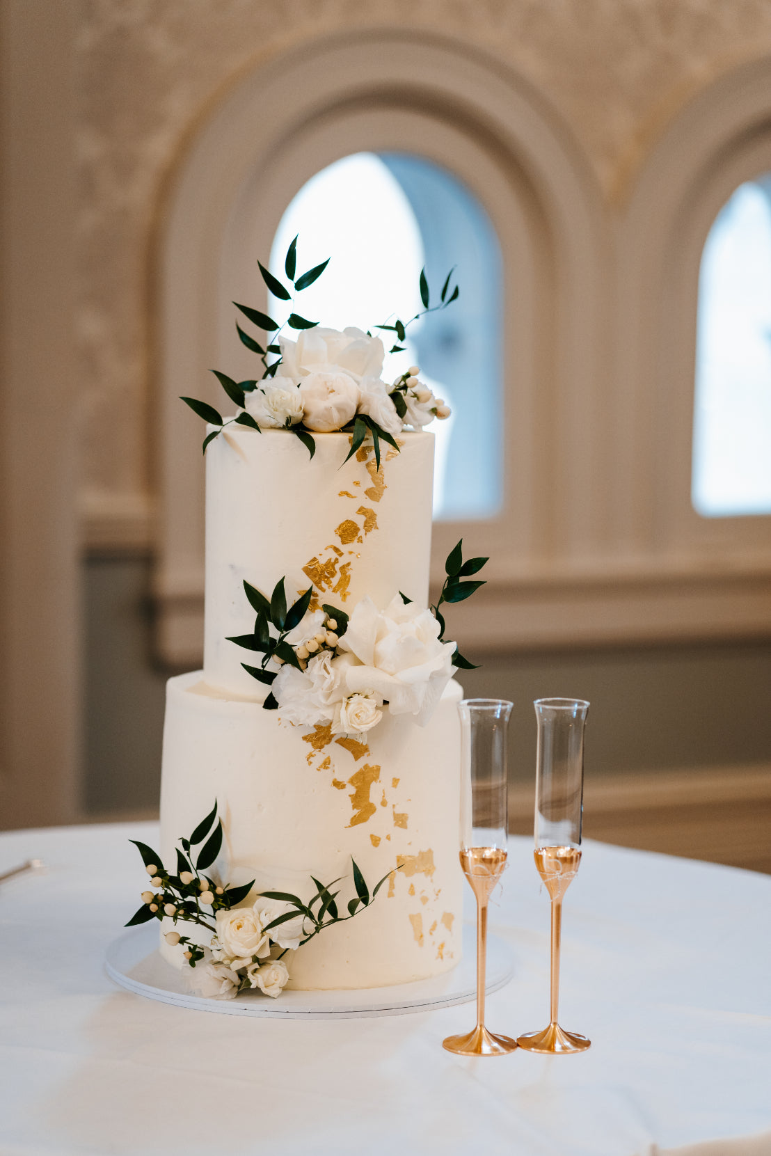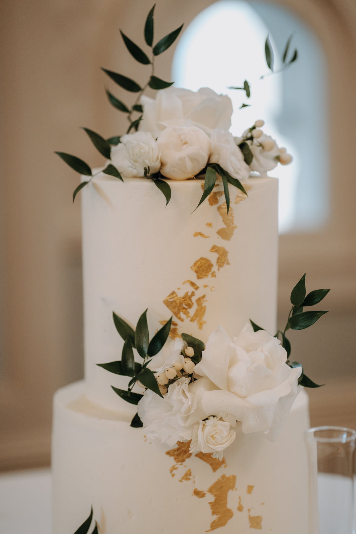 Stephanie’s bridal bouquet features white peonies and white roses, balanced with the textured of hypericum and lisianthus.