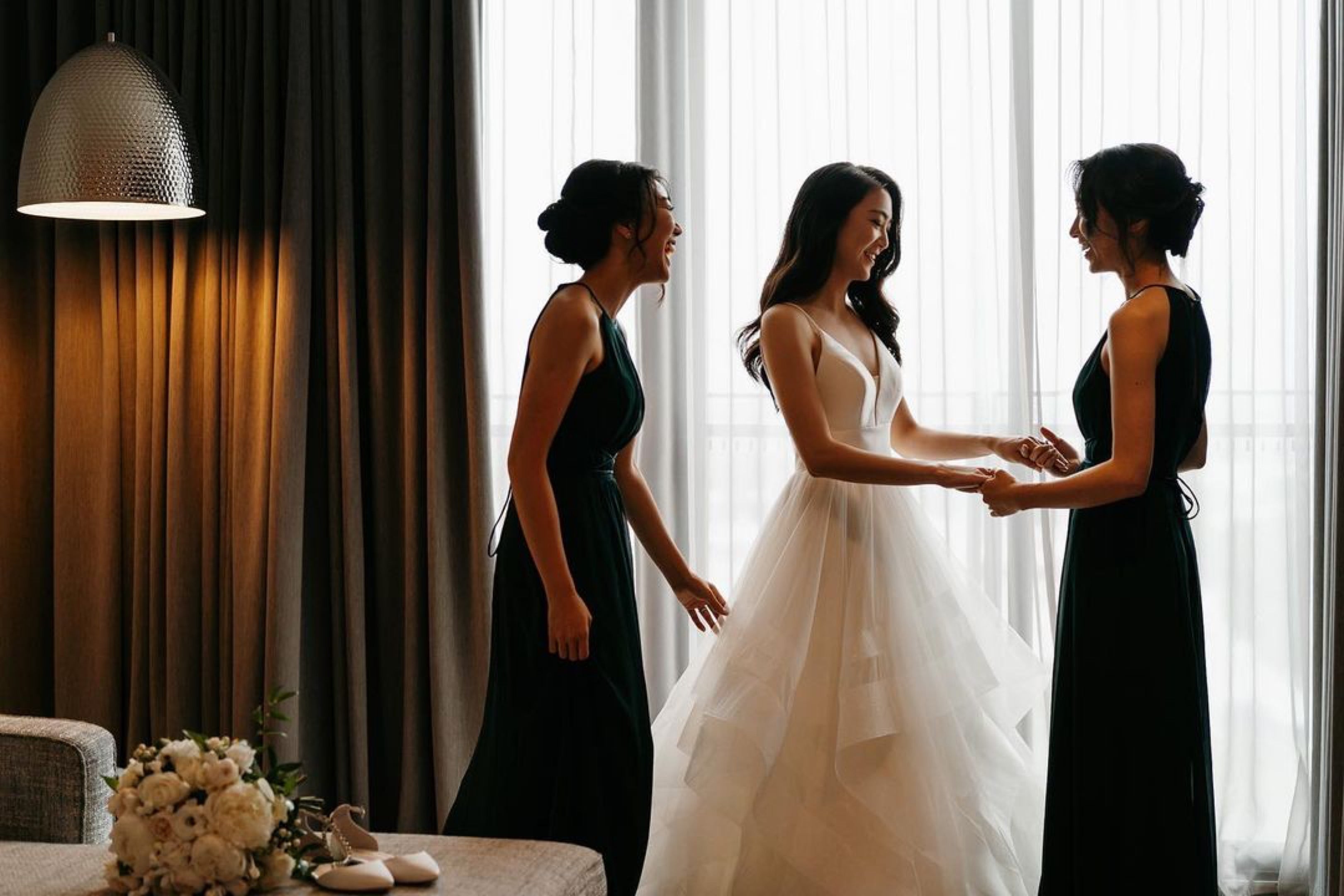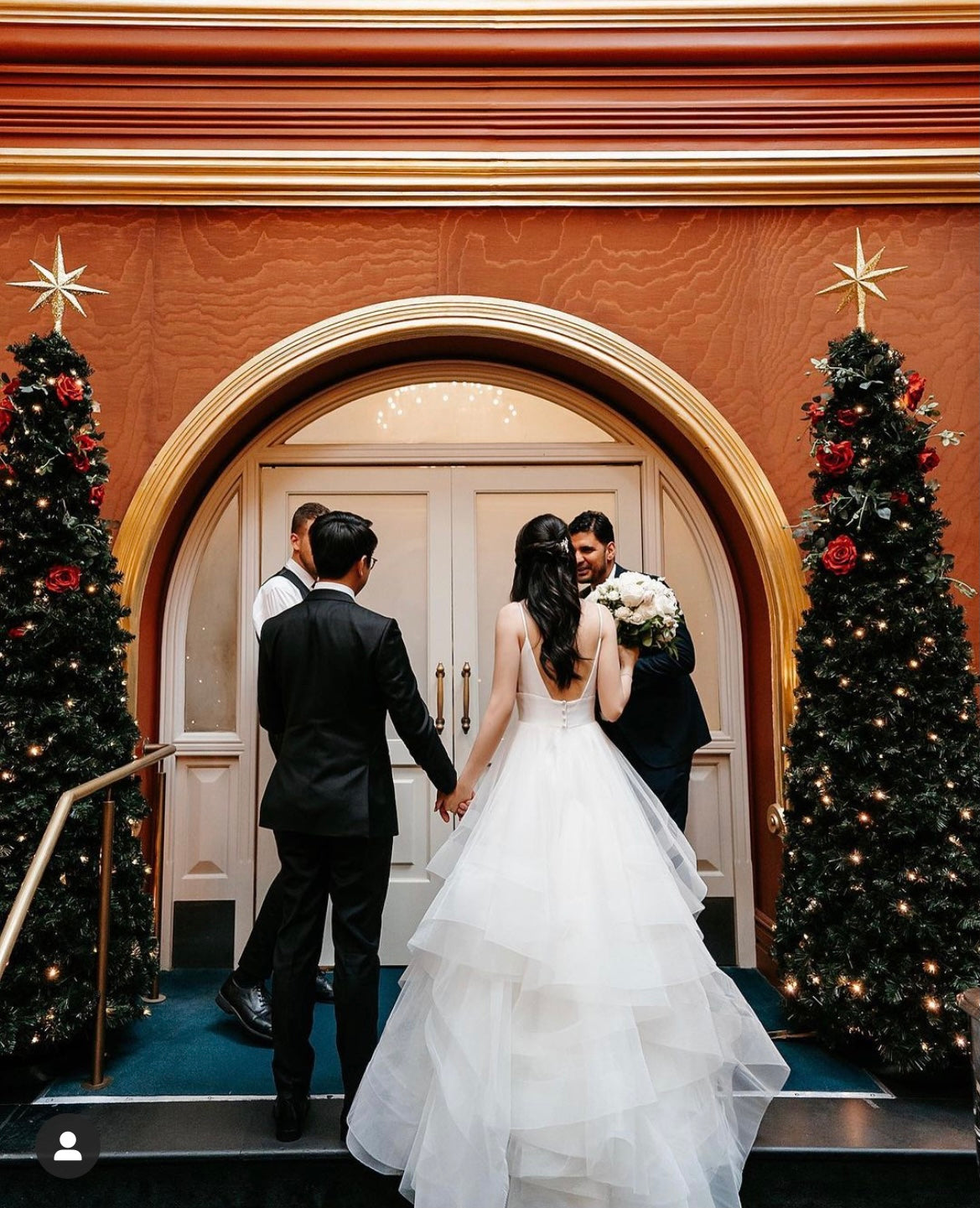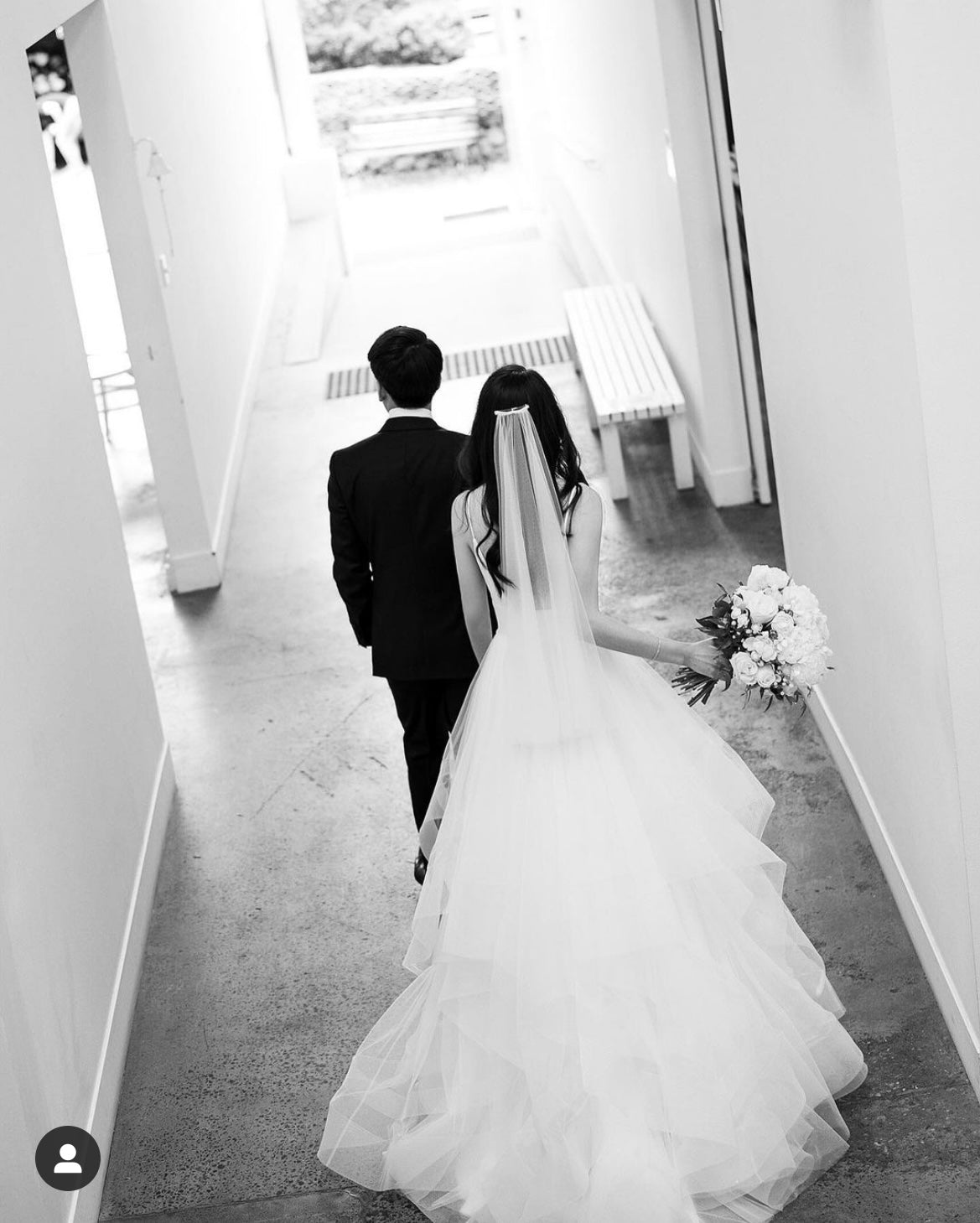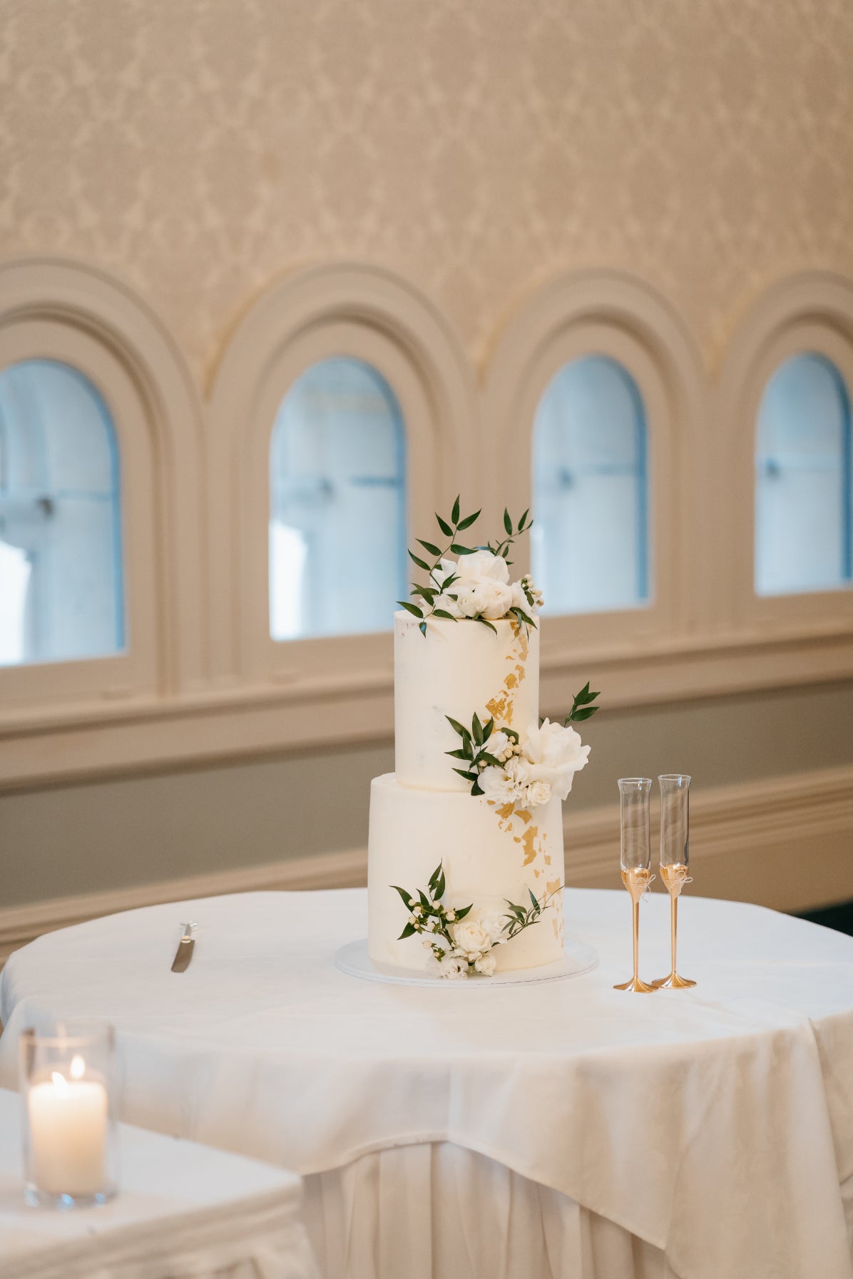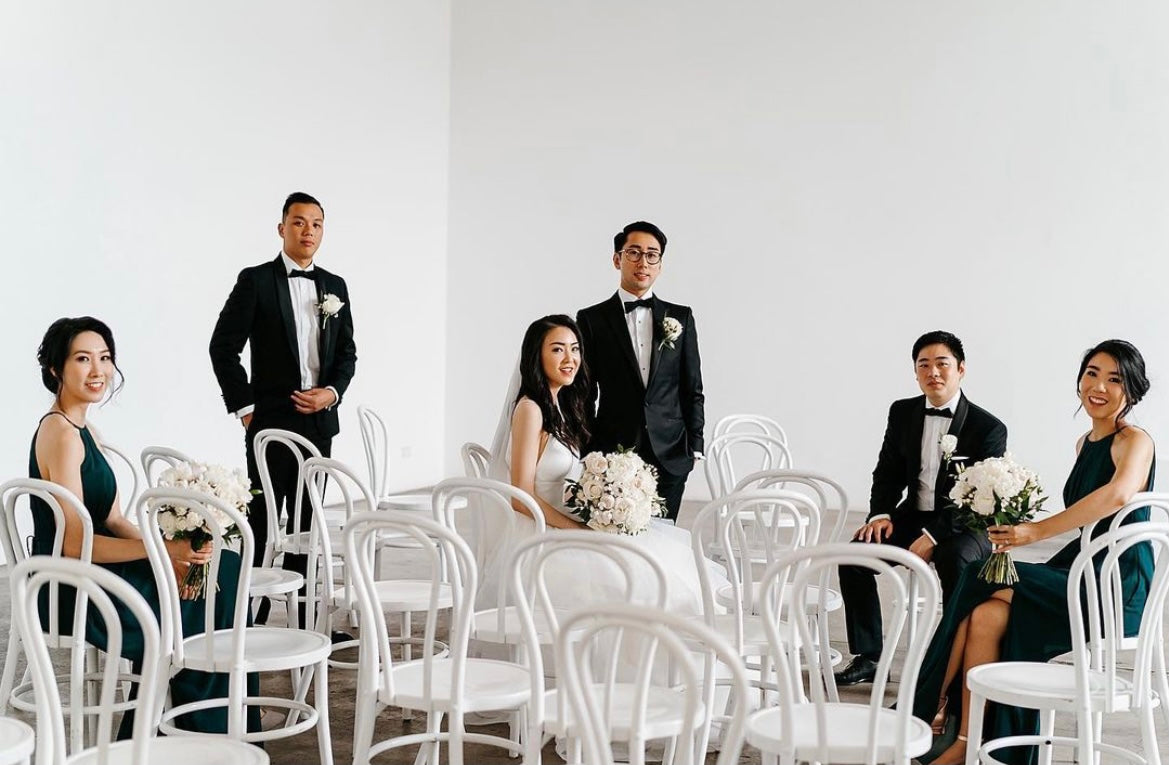 Stephanie’s bridal bouquet features white peonies and white roses, balanced with the textured of hypericum and lisianthus.