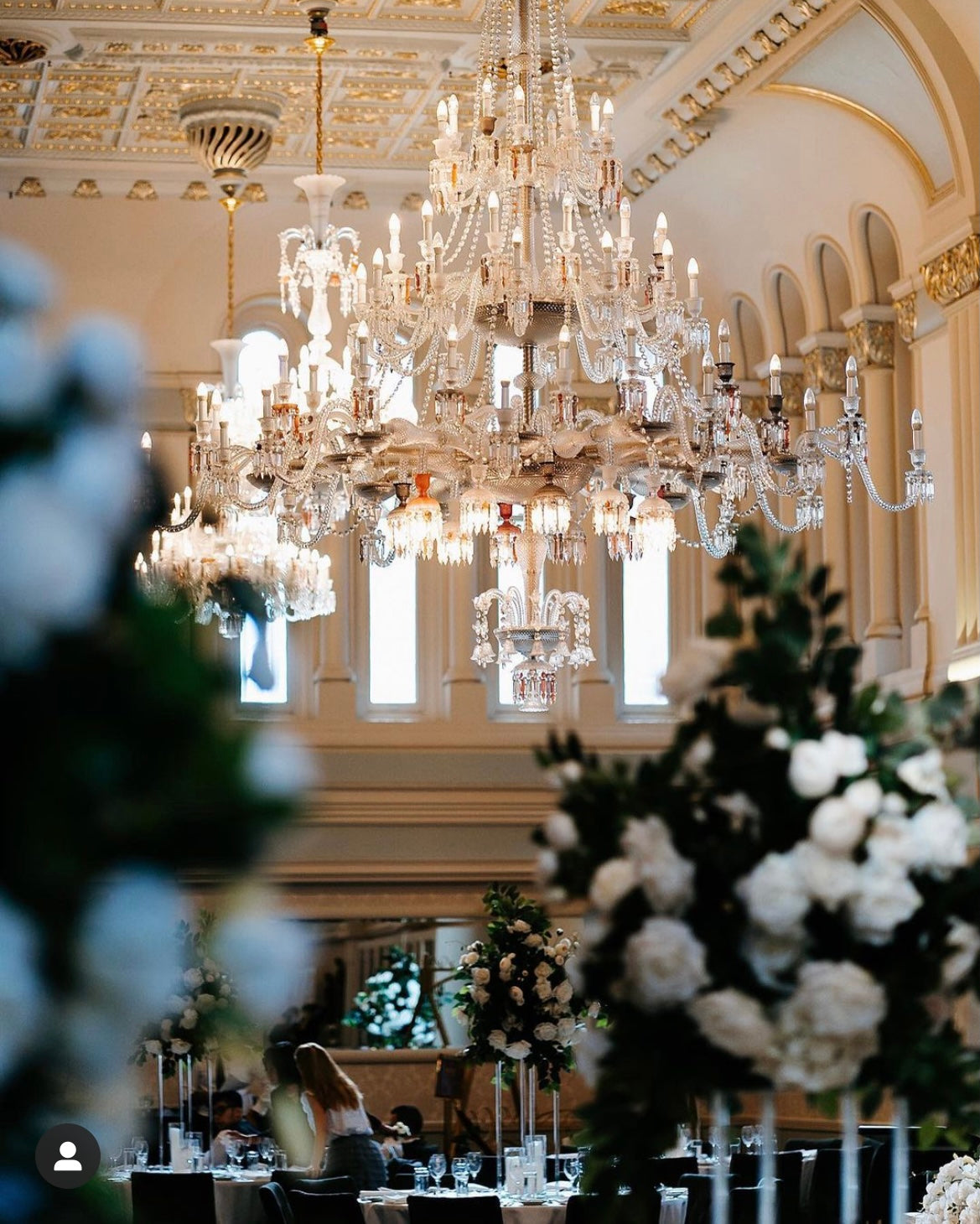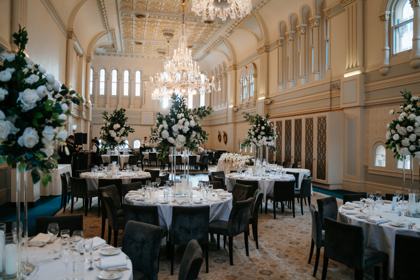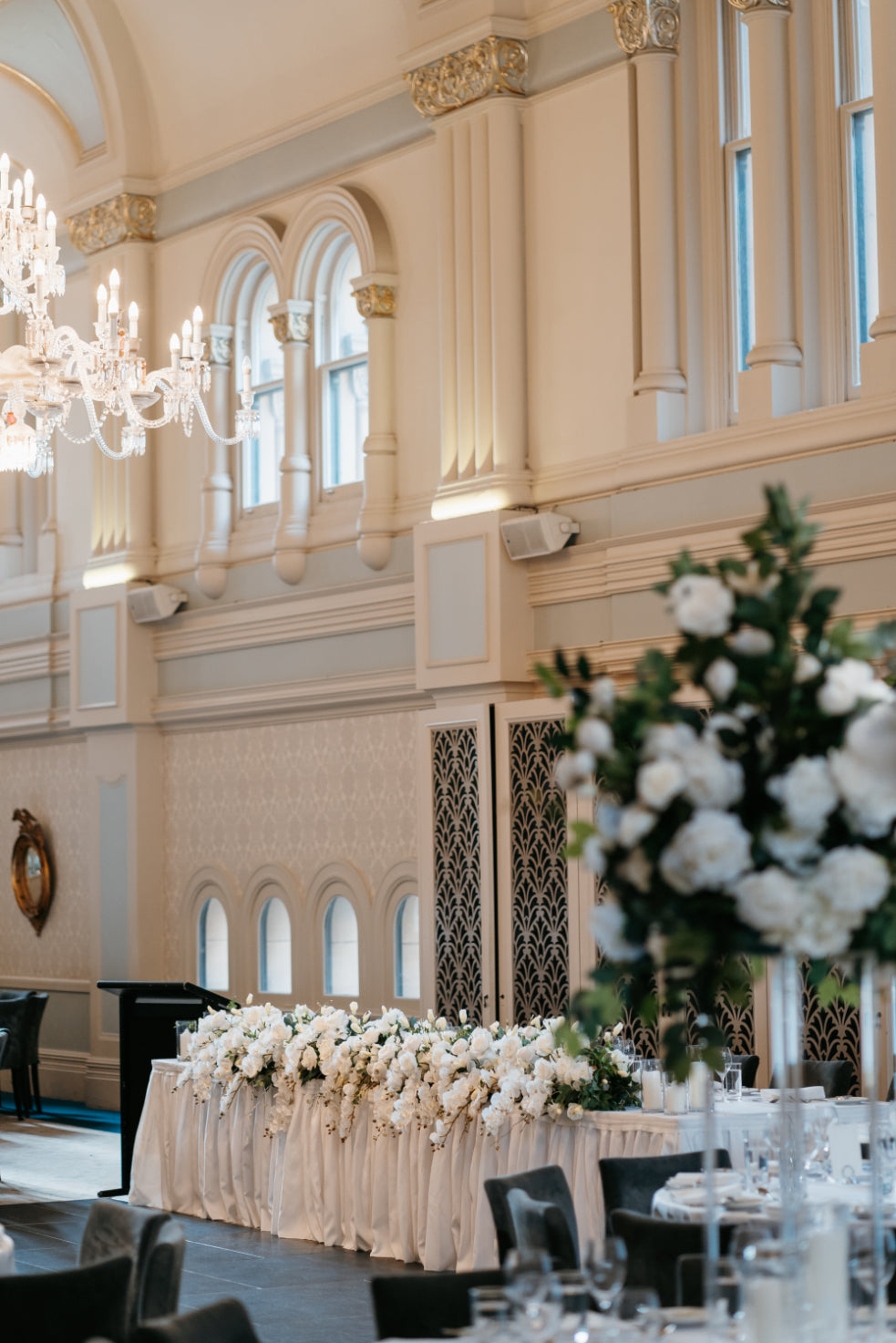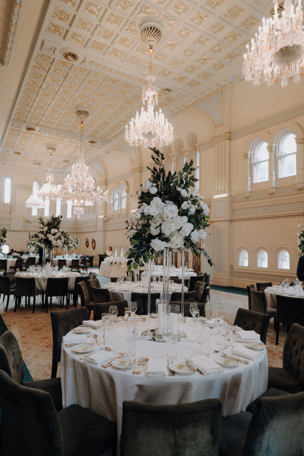Reception are all tall centerpiece to complement the QVB Tearoom’s chandeliers and the high ceilings.