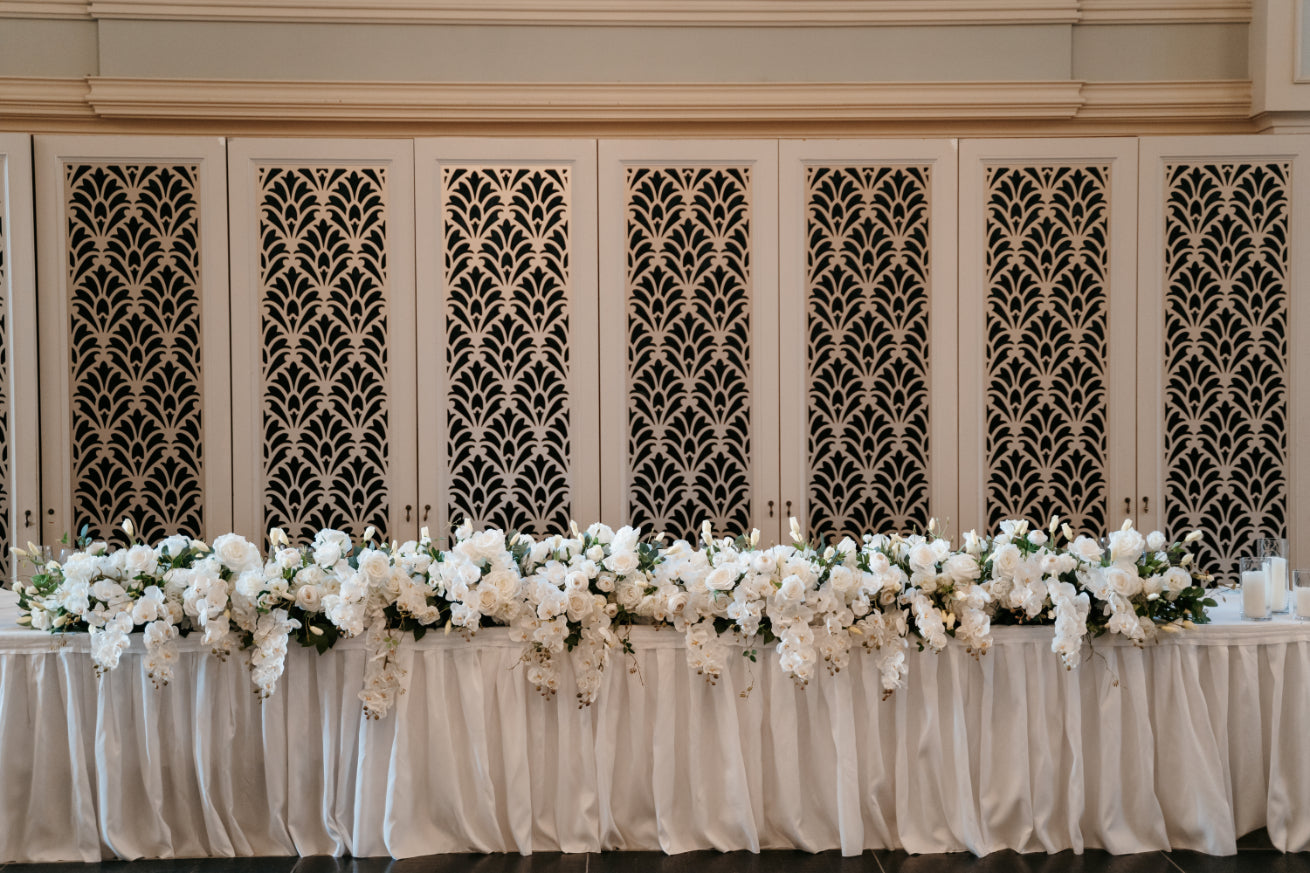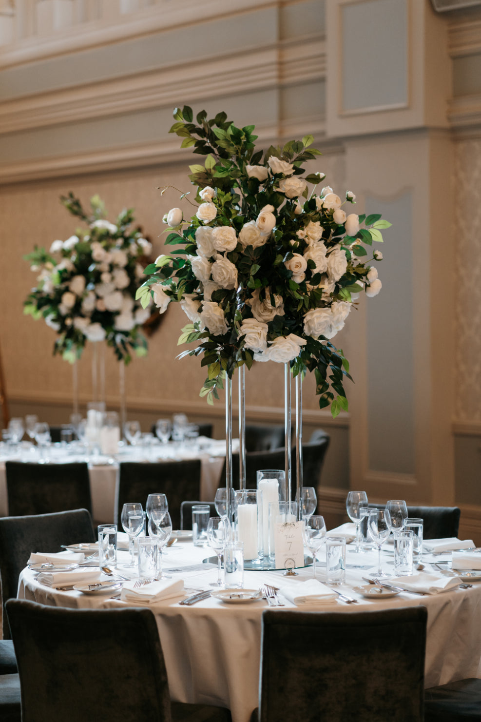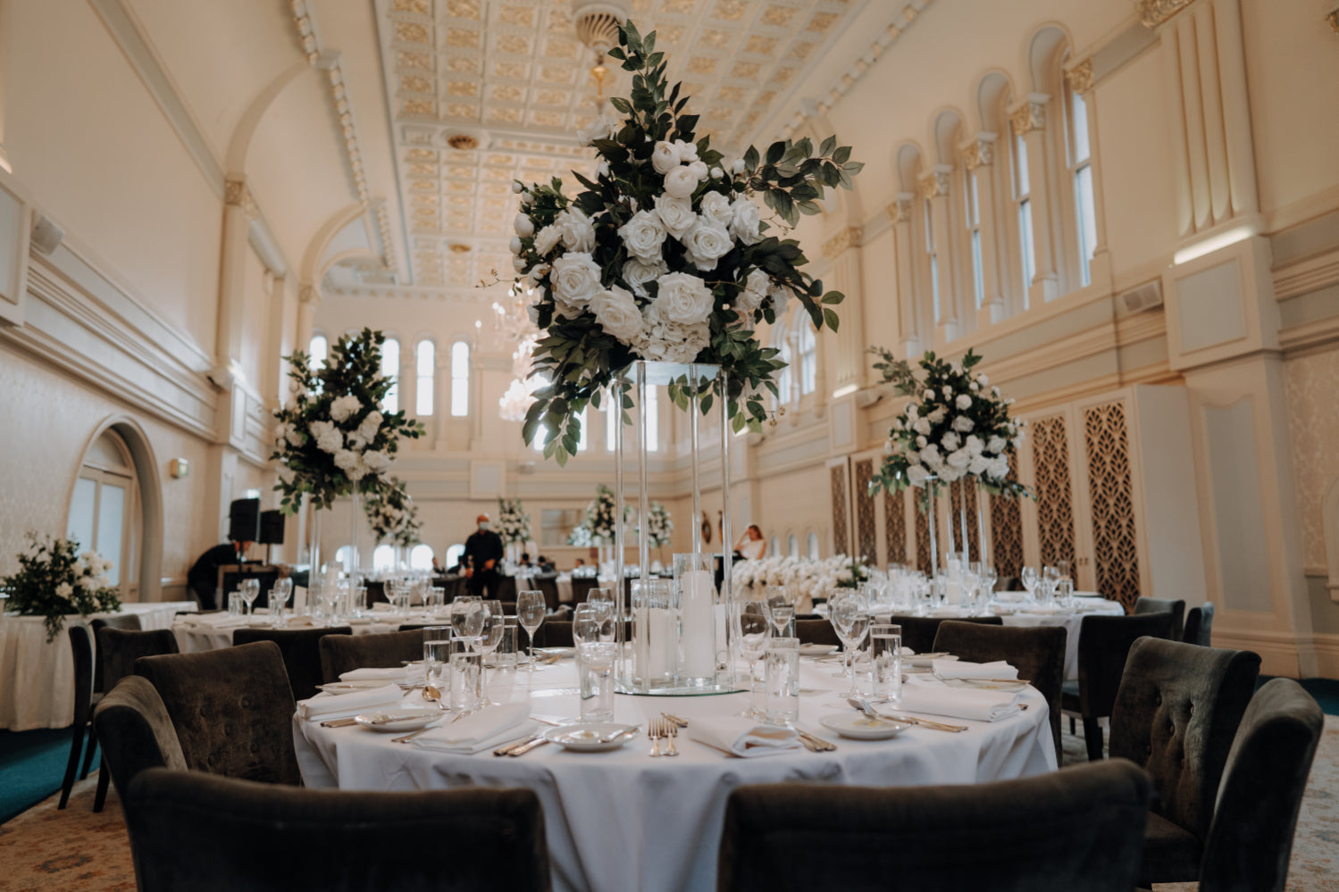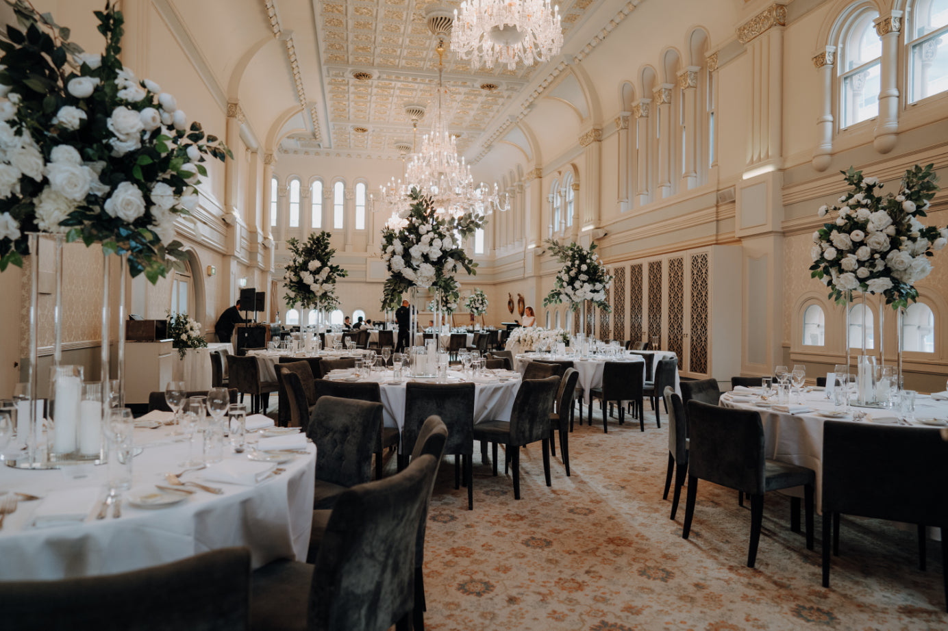Reception are all tall centerpiece to complement the QVB Tearoom’s chandeliers and the high ceilings.
